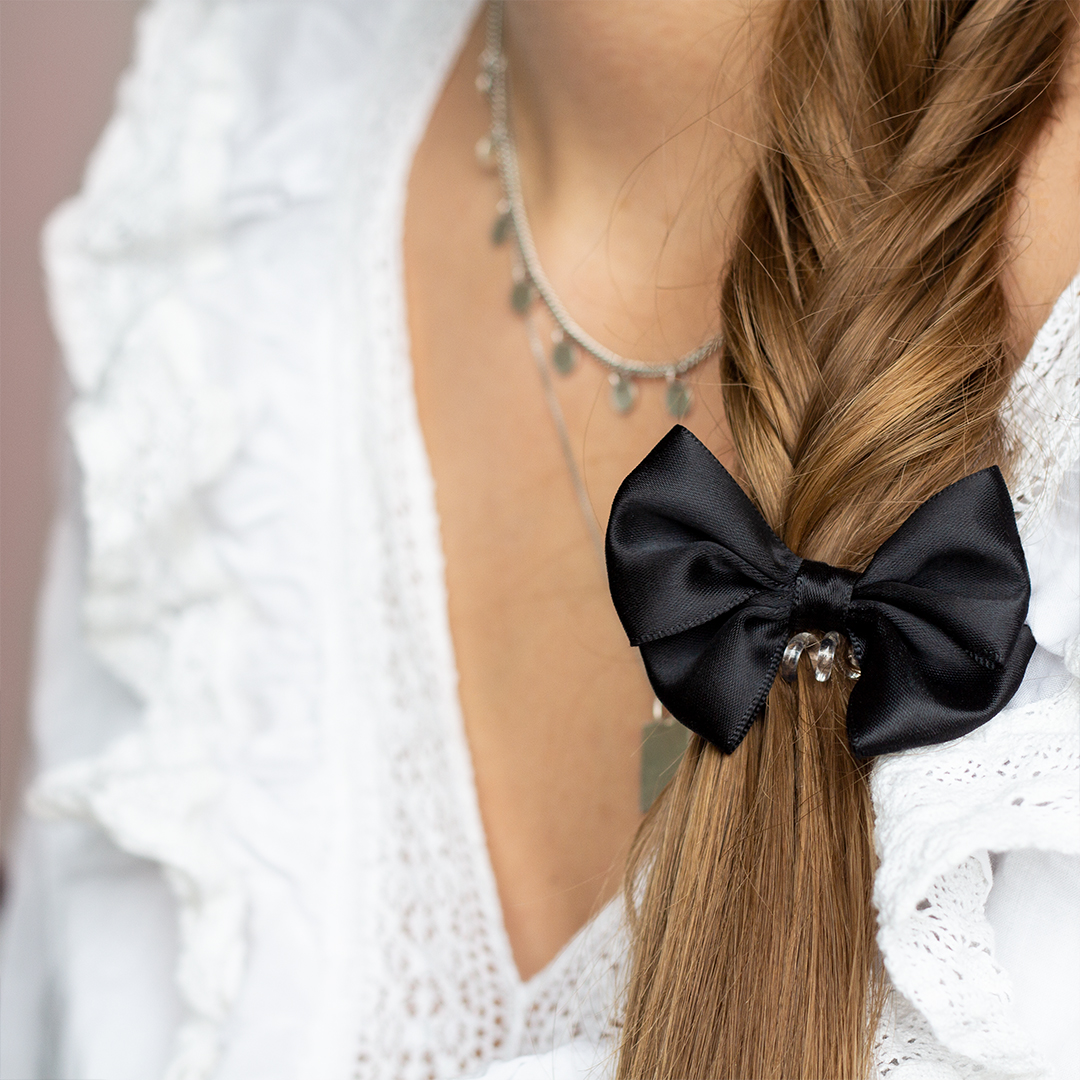 Il fiocco è tornato! Giocando sull’immagine della “brava ragazza”, Invisibobble BOWTIQUE trasforma le classiche pony tail, le trecce e i bun, in look alla moda. Un tocco in più per creare acconciature originali ed elevare anche le più semplici. BOWTIQUE di Invisibobble è l’alternativa chic per raccogliere trecce e code: un fiocco in raso nero, su un elastico traceless. Grazie alla resina artificiale da cui è composto, non tira o strappa i capelli nel momento di scioglierli. Inoltre, grazie al doppio fiocco, non è solo bellissimo fra i capelli ma anche al polso.