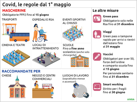 Come riporta l`ordinanza firmata ieri dal ministro della Salute Roberto Speranza, da domenica 1° maggio l`obbligo di mascherina al chiuso viene prorogato fino al 15 giugno per l`accesso a tutti i mezzi di trasporto pubblico, cinema, teatri, sale da concerto, ospedali e Rsa.