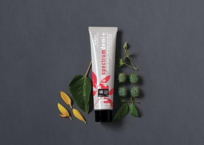 Full Spectrum Demi+TM è formulato con un blend ricostituente di olii vegetali biologicamente certificati, di Girasole, Ricino, Jojoba e Kukui, che aiutano a nutrire il capello durante il trattamento, e allo stesso tempo donano una lucentezza immediata e un colore radioso, riparando i capelli danneggiati.