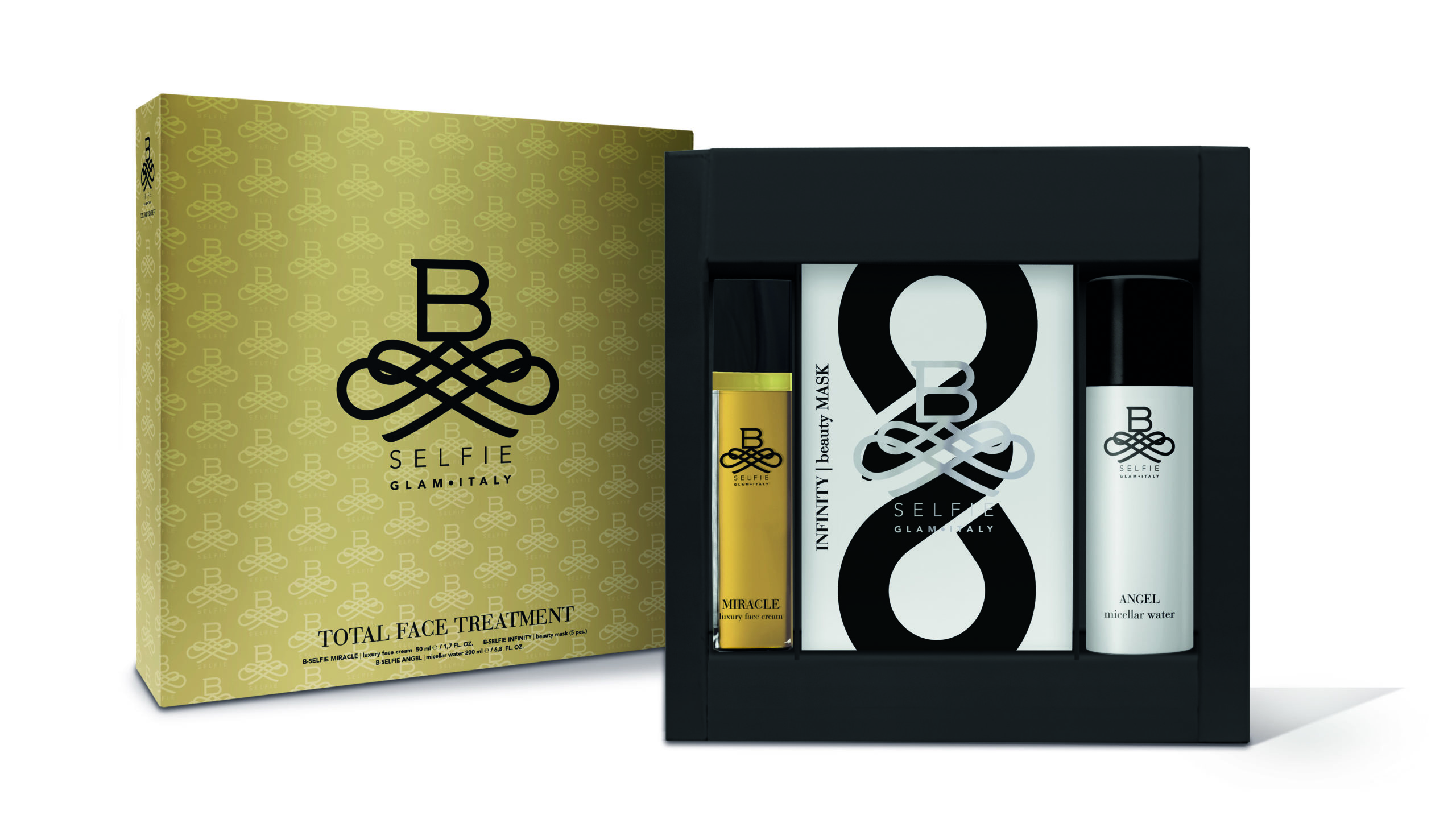B-SELFIE Total Face Treatment: 5 maschere B-SELFIE Infinity per una sferzata di energia alla pelle in soli 20’, sostenuta dell’acqua micellare B-SELFIE Angel e dalla crema viso anti-age B-SELFIE Miracle (prezzo consigliato al pubblico 139 €).