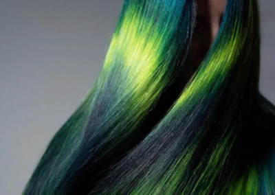 Il colore dei capelli della sua cliente si muove con armonia dai toni del profondo turchese alle radici prima di sfumare in giallo-verde neon. Dalla metà delle lunghezze fino alle punte, invece, vira sul nero con alcuni sprazzi di verde e turchese che lo attraversano dandogli luce.