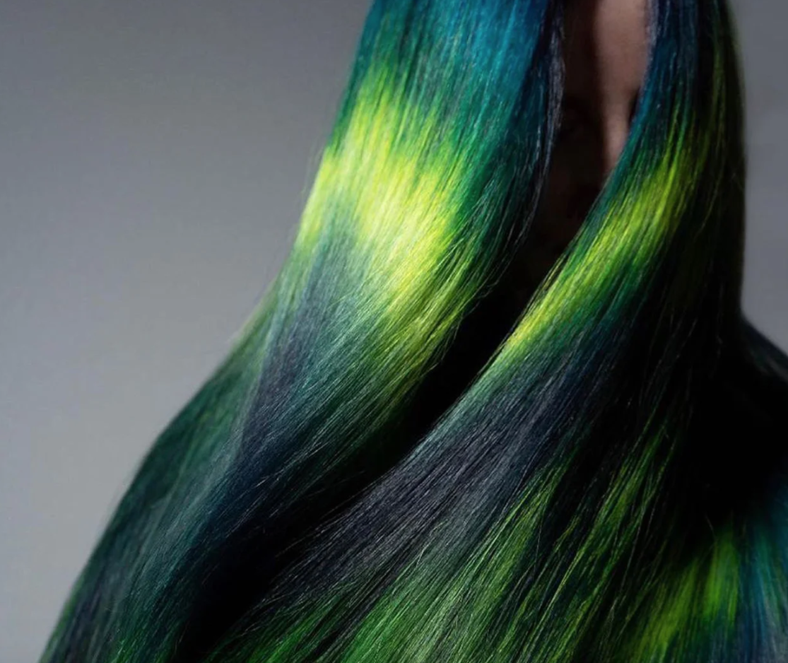 Il colore dei capelli della sua cliente si muove con armonia dai toni del profondo turchese alle radici prima di sfumare in giallo-verde neon. Dalla metà delle lunghezze fino alle punte, invece, vira sul nero con alcuni sprazzi di verde e turchese che lo attraversano dandogli luce.