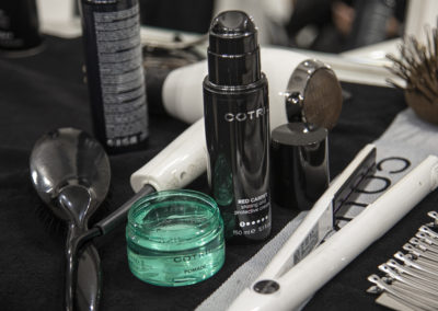 L’effetto leggermente wet è stato dato da POMADE Water Wax, la cera modellante trasparente a base acquosa, arricchita con Aloe Vera e Pantenolo, perfetta per controllare e fissare i capelli senza irrigidirli che, mixata con RED CARPET, crea un look flessibile dal finish lucido e una tenuta forte.