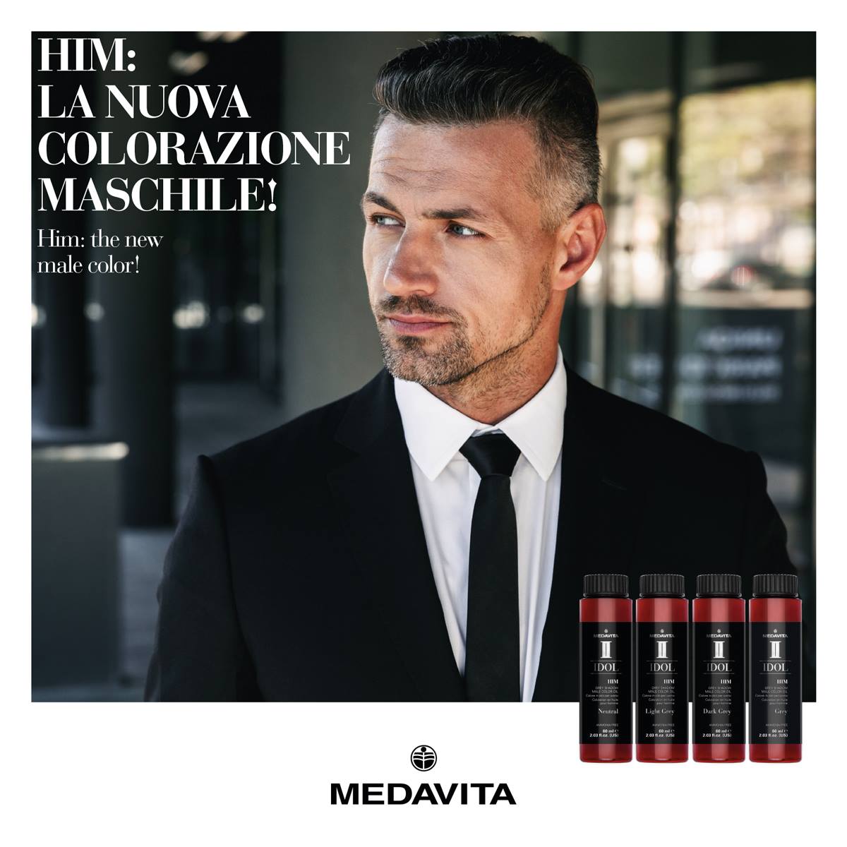 Medavita risponde a tutte queste esigenze con Idol Man HIM, il nuovo sistema di copertura naturale dei capelli bianchi ideale per l’uomo che ama prendersi cura di sé e che deidera un risulato naturale in sintonia con la propria età e il proprio colore di base.