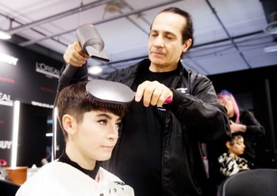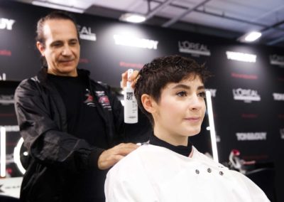 Per dare forma allo styling, i capelli sono stati preparati applicando da bagnati lo spray termo-modellante Tecniart PLI Shaper di L’Oréal Professionnel, utile per idratare la chioma e preparare le lunghezze, divise in sezioni prima del taglio, alla successiva fase di asciugatura.