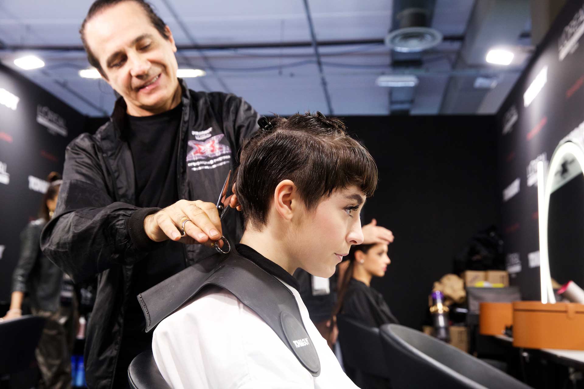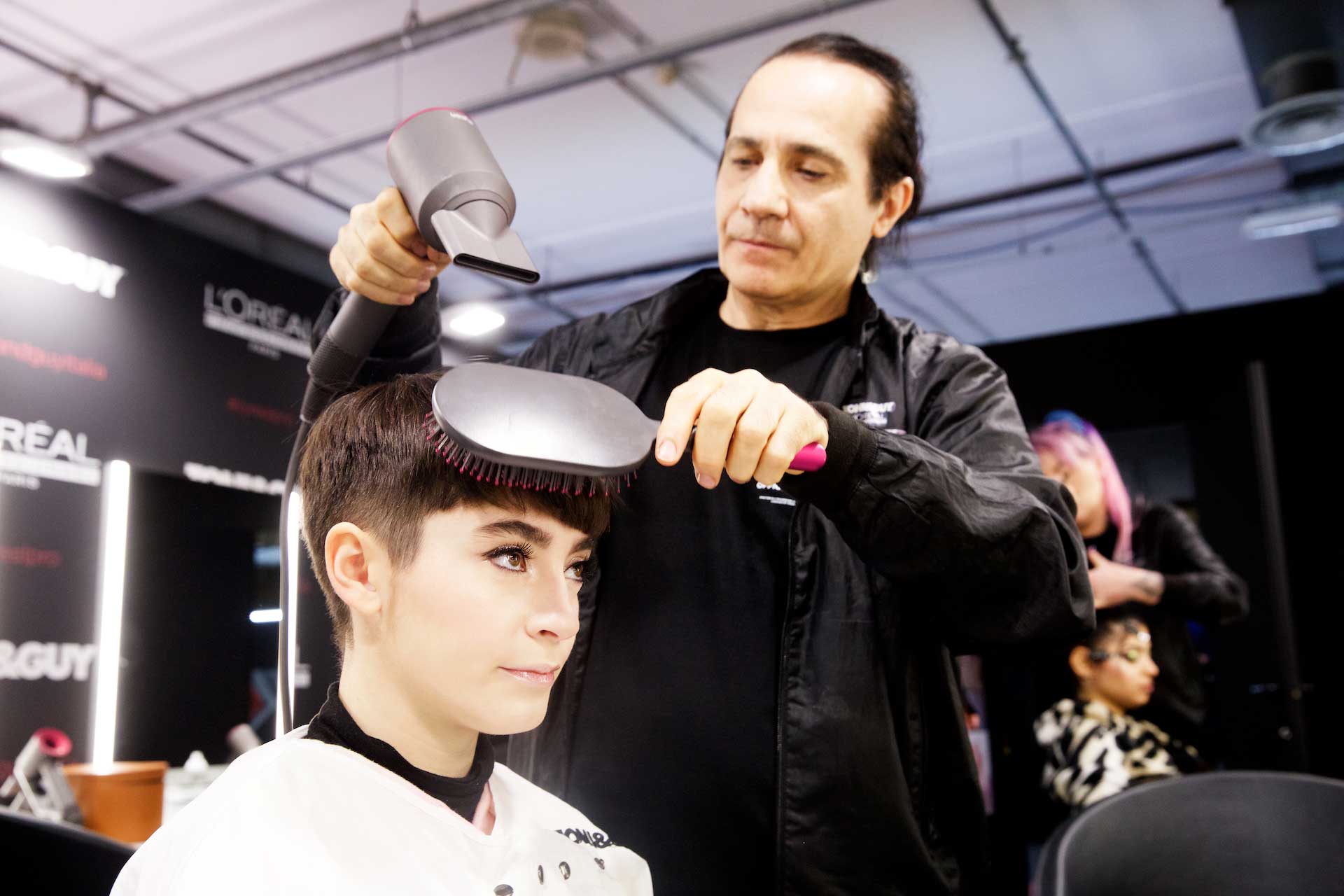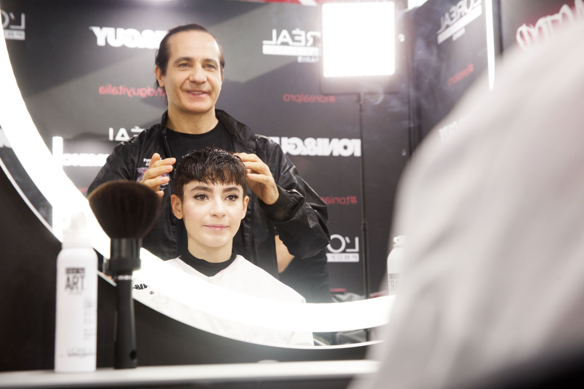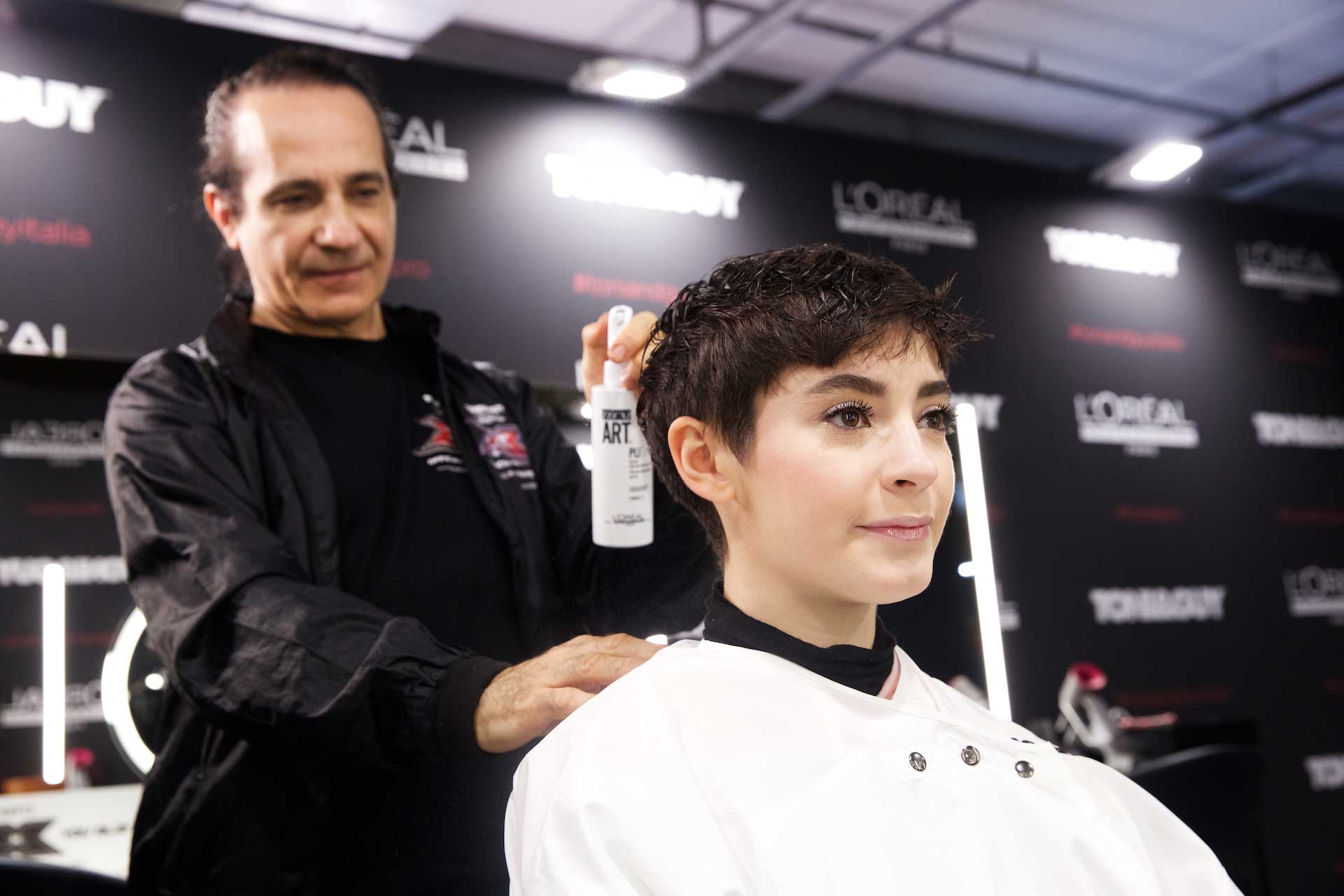 Per dare forma allo styling, i capelli sono stati preparati applicando da bagnati lo spray termo-modellante Tecniart PLI Shaper di L’Oréal Professionnel, utile per idratare la chioma e preparare le lunghezze, divise in sezioni prima del taglio, alla successiva fase di asciugatura.