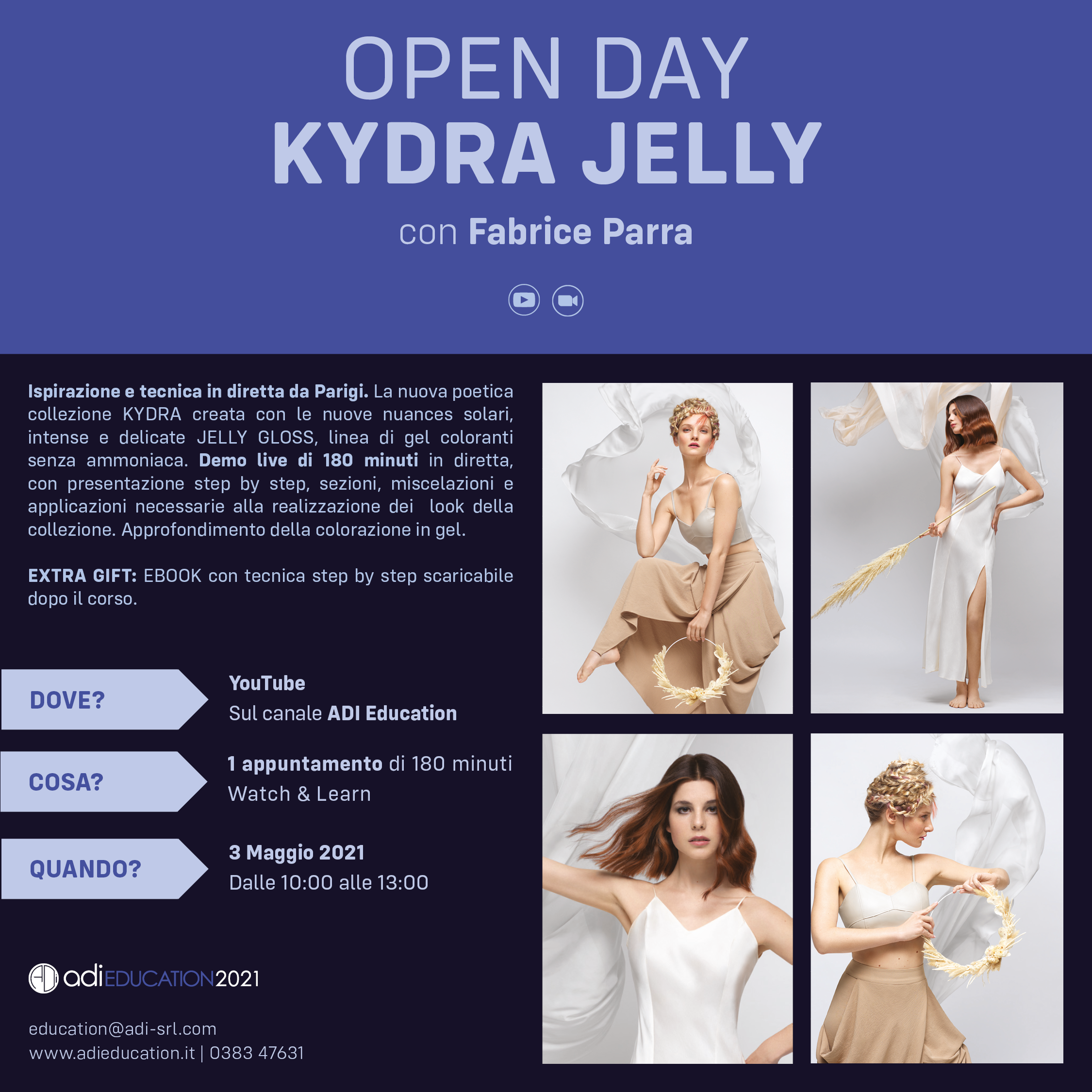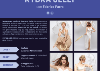 Si tratta di una demo live di 180 minuti in diretta, con presentazione step by step, sezioni, miscelazioni e applicazioni necessarie alla realizzazione dei look della collezione. Approfondimento della colorazione in gel.