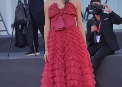 Per la giovane e bellissima attrice un look boho chic che esalta i suoi capelli naturalmente mossi; le ciocche sono state riprese successivamente con il ferro per dare maggior tenuta e definizione e il look è stato impreziosito dall’aggiunta di alcune trecce per un effetto volutamente in contrasto con l’abito romantico.