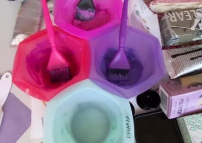 I colori usati fanno parte della gamma dei colori diretta Pulp Riot che loro utilizzano regolarmente in salone e si tratta di un mix fra Blush, baby pink dai toni pastello, Lilac, intesa sfumatura lavanda, Violet, il viola più intenso e Seaglass, verde acqua. Il tutto sapientemente stemperato col Clear.