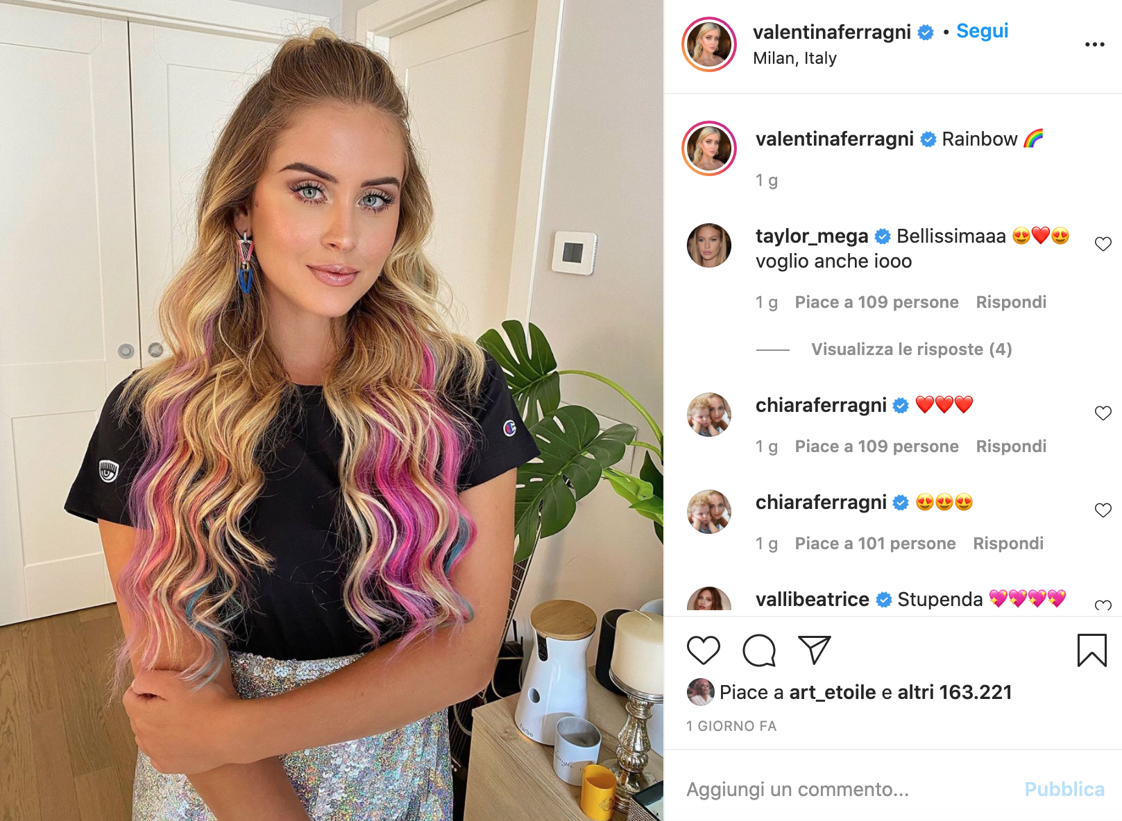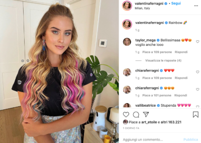 Se però non siete pronte a una chioma multicolor come quella di Fedez potete, comunque, optare per una soluzione meno invasiva e più easy come quella della cognata del rapper, Valentina Ferragni, che ha scelto di colorare solo alcune ciocche in stile “Barbie capelli arcobaleno”…. in ogni caso, amici parrucchieri, preparatevi perchè pioveranno richieste di capelli caleidoscopici!!