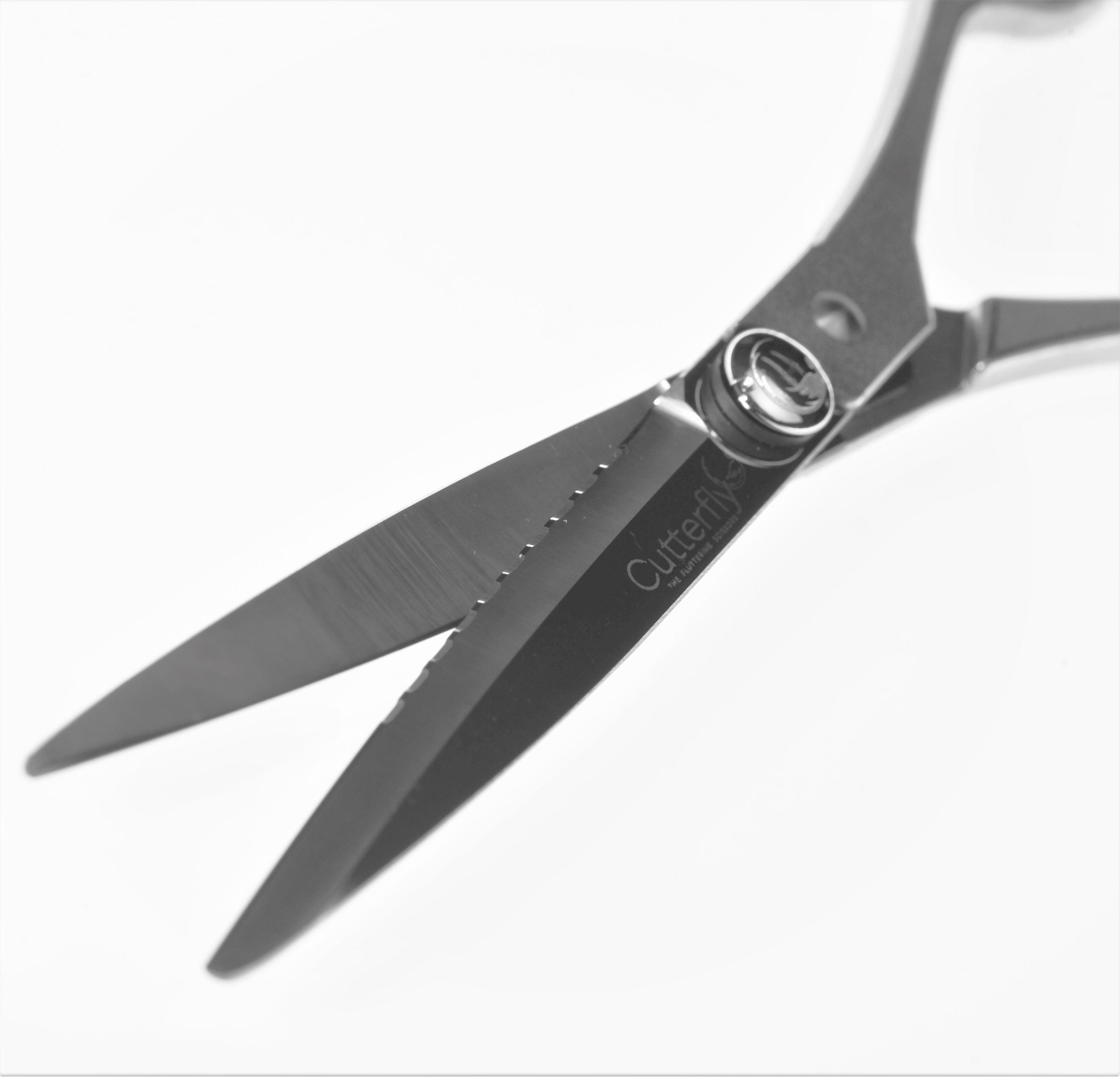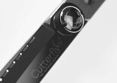Il segreto per tagli netti perfetti, con trattenimento della ciocca, e per eseguire point cut e piccoli slide è Cutterfly Maxx, la forbice studiata e sviluppata per questi tagli grazie ai suoi 2/3 di lama seghettata e alla rimanente parte con lama liscia.