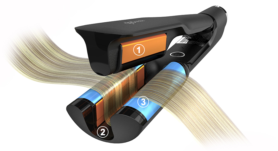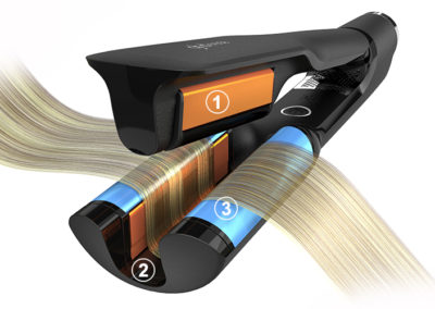 Il prodotto: i capelli passano attraverso un cilindro dal design unico a forma di U, realizzato con 4 differenti lamelle in ceramica. Quando una ciocca attraversa la zona riscaldata, lì si forma il riccio. Quando il capello scivola fuori dal cilindro a U, si imbatte nel sistema di raffreddamento che rapidamente raffredda il capello e definisce così il riccio. Inoltre, la presenza di una zona fredda rende il tool freddo al tatto e consente di posizionare le lamelle direttamente alle radici, per un’esperienza di styling più confortevole. Lo styling del capello viene effettuato alla temperatura ottimale di 185°C, cioè quando entra nella fase di glass transition, la fase in cui il materiale passa da uno stato solido e fragile ad uno malleabile e plastico… nell’ hair styling questa è la temperatura in cui i capelli possono essere modellati senza subire danni.