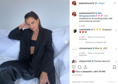 Se al look capelli aggiungiamo un outfit con blazer maschile oversize e reggiseno a fascia in vista possiamo concludere che la Holmes ha davvero deciso di osare e il risultato è super sexy.