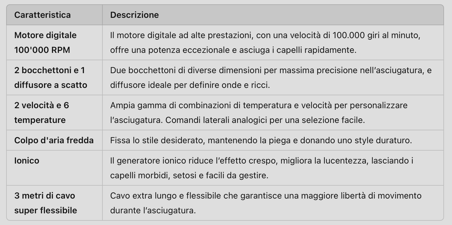 I comandi laterali a leva, tipici dei phon tradizionali, offrono un’esperienza d’uso familiare, ma con l’aggiunta di un motore digitale che permette prestazioni superiori. Il risultato è un’asciugatura veloce e precisa, senza rinunciare alla facilità di utilizzo.