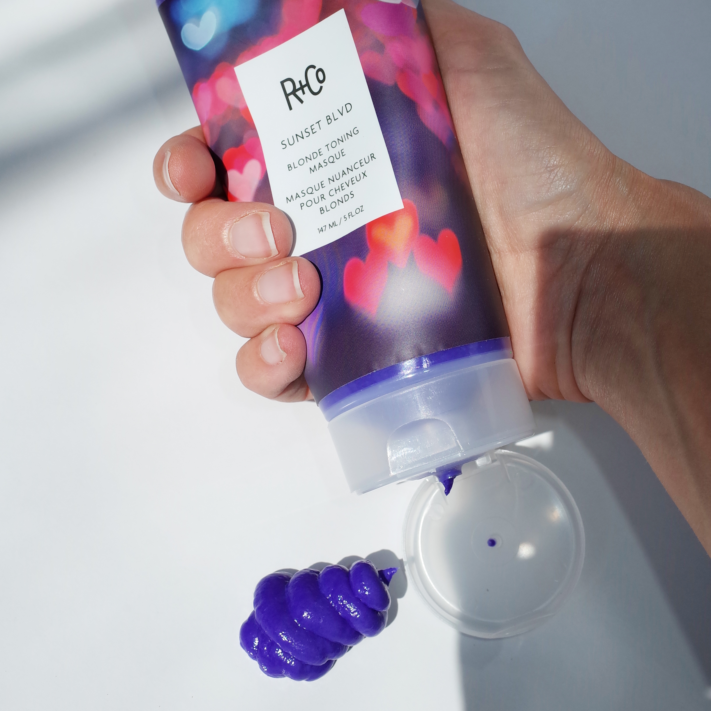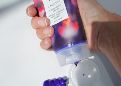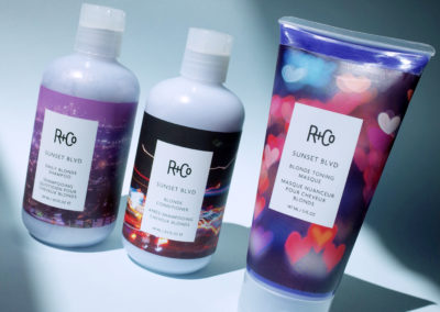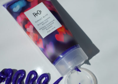 Per recuperare il colore il suo consiglio è quello di andare a creare un percorso tonalizzante al lavatesta con la linea Sunset BLVD di R+Co, composta da shampoo, conditioner e mask, e