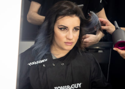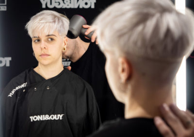 Il punto centrale della trasformazione è il taglio, una variazione di “Shape-up” proposta nel Trend Report 2020 di TONI&GUY: forme geometriche e molto grafiche nella parte inferiore della testa, ottenute lavorando i capelli con lo spray termo-attivo Tecniart Constructor. La parte superiore invece, è stata scalata e alleggerita creando un movimento decisamente più audace. Per la definizione è stata applicata la cera modellante Tecniart Density Material, ideale per i tagli corti e definiti. I capelli sono quindi messi in piega con l’asciugacapelli Dyson Supersonic, dotato del beccuccio lisciante, per ottenere un effetto liscio morbido e naturale. Per definire i dettagli dell’acconciatura è stato successiva- mente utilizzato il beccuccio concentratore, lavorando i capelli una sezione alla volta.