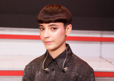 L’ispirazione del taglio, punto centrale della trasfor- mazione, è “Shape-up”, una delle nuove tendenze con- tenute nel Trend Report 2020 di TONI&GUY. Il look richiama una figura androgina dalle forme corte e dalle gradazioni ben definite: le parole d’ordine sono preci- sione, rotondità nei volumi e definizione nel taglio. La frangia è stata lavorata, arrotondandola per far risaltare i lineamenti di Sofia.