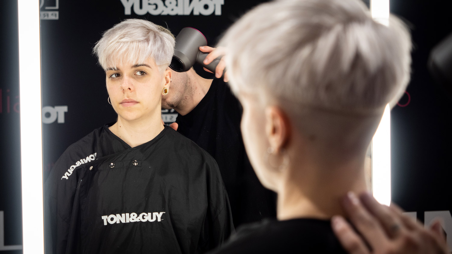 Il punto centrale della trasformazione è il taglio, una variazione di “Shape-up” proposta nel Trend Report 2020 di TONI&GUY: forme geometriche e molto grafiche nella parte inferiore della testa, ottenute lavorando i capelli con lo spray termo-attivo Tecniart Constructor. La parte superiore invece, è stata scalata e alleggerita creando un movimento decisamente più audace. Per la definizione è stata applicata la cera modellante Tecniart Density Material, ideale per i tagli corti e definiti. I capelli sono quindi messi in piega con l’asciugacapelli Dyson Supersonic, dotato del beccuccio lisciante, per ottenere un effetto liscio morbido e naturale. Per definire i dettagli dell’acconciatura è stato successiva- mente utilizzato il beccuccio concentratore, lavorando i capelli una sezione alla volta.