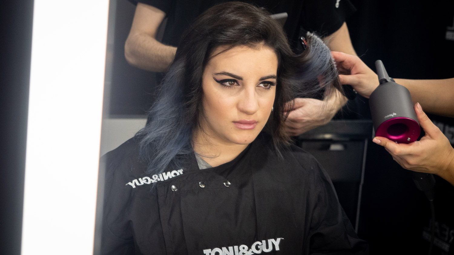 Per Giordana, 17enne concorrente catanese appartenente al team “Under Donne” la parola chiave del suo look è tras-formazione: l’Hair Team ha rivoluzionato colore e taglio e ideato uno styling ad effetto naturale. L’ispirazione è “Califor-nia dream”: onde morbide e sofisticate, ottenute senza sforzo apparente, ma con una decisa anima rock’n’roll. A guidare il restyling di Giordana è Making Waves, uno degli stili inclusi nella collezione Trend Report 2020 di TONI&GUY: un taglio scalato e leggero con un ciuffo laterale molto versatile, in grado di valorizzare il nuovo grintoso colore dei capelli. Via libera allora a una decisa schiaritura nella parte interna delle lunghezze, creata per dare leggerezza al taglio. L’effetto luce è stato tonalizzato con majirel glow per dare un boost di luminosità, attraverso la tecnica Glow Factor di TONI&GUY, giocando su due diverse sfumature di colore blu traslucente e opalescente. Per lo styling: fondamentale l’applicazione della mousse Tecniart Volume Lift per creare lo stacco alle radici, prima di procedere all’asciugatura con Dyson Supersonic. Viene sfruttato uno degli accessori magnetici di cui è dotato, il beccuccio concentratore: più largo e sottile, grazie anche all’aiuto di una spazzola, consente di lavorare una sezione alla volta e dare movimento ai capelli. Le onde sono state infine definite grazie all’impiego dei coni da 30mm dello styler Dyson Airwrap, che sfrutta il cosiddetto “effetto Coanda” per mettere in piega le ciocche grazie alla combinazione unica di aria e calore.