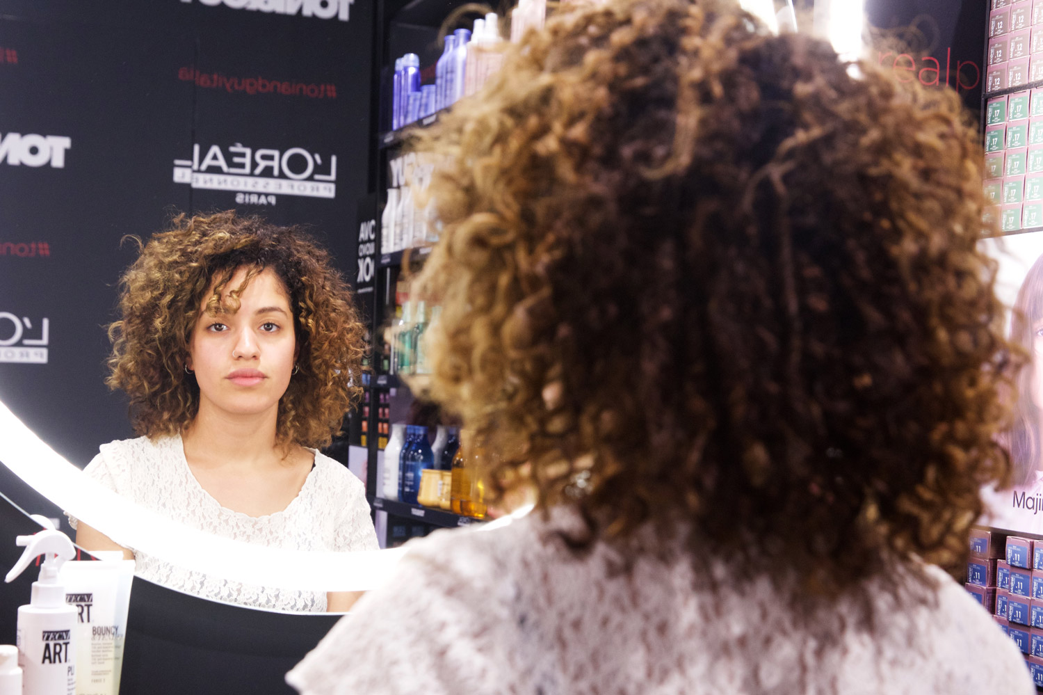 Per preparare i capelli allo styling é stato usato lo spray termo modellante Tecniart PLI Shaper di L’Oréal Professionnel. A questo ha fatto seguito l’applicazione di Tecniart Bouncy &Tender, la crema-gel volumizzante, ideale per esaltare e definire i ricci, proteggendoli dall’umidità.
