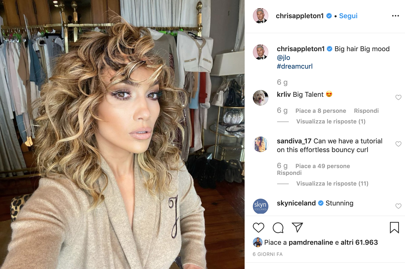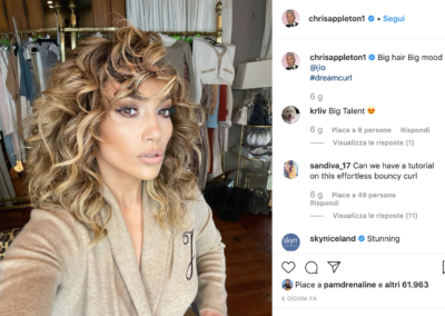 Jennifer Lopez ha postato su Instagram un suo video in cui appare con un’inedita chioma super curly, opera dell’hairtylist delle star Chris Appleton.