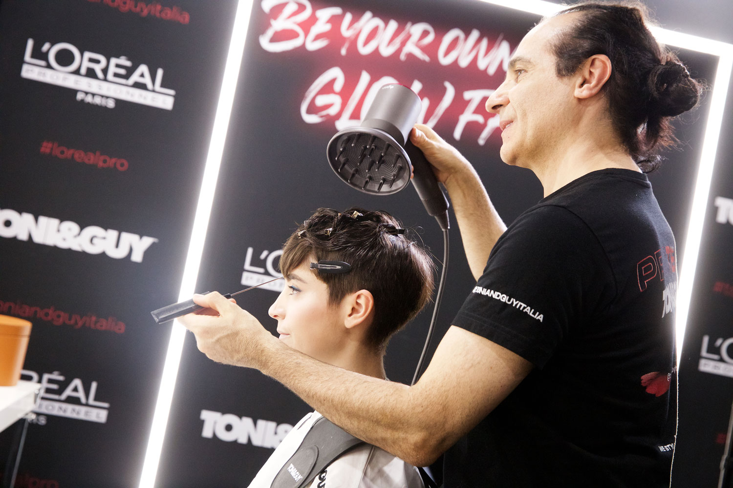 Per ottenere volume i capelli sono stati lavorati con la mousse Tecniart Volume Lift e asciugati nella parte superiore, utilizzando il diffusore dell’asciugacapelli Dyson Supersonic che disperde il calore in modo omogeneo ed elimina l’effetto crespo. Per definire la parte inferiore è stato invece utilizzato il beccuccio concentratore, più largo e sottile, per uno styling preciso. Il tocco di tenuta e definizione finale si ottiene lavorando le punte con la Transformer Lotion e la cera Density Material, entrambe di Tecniart.
