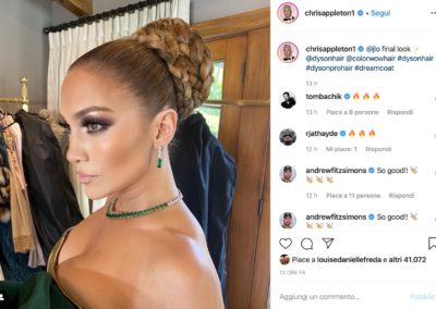 Ma quello che ci è piaciuto di più è stato il suo hairlook caratterizzato da un raccolto alto e costruito lavorato a trecce dall’effetto quasi rinascimentale. Per un’occasione così importante Jennifer Lopez non poteva affidarsi ad un hairtylist qualsiasi e, come sempre, si è rivolta al fidato Chris Appleton che ha condiviso parte del suo processo di styling con Allure: la base per le trecce è un’elegante coda di cavallo divisa in due sezioni che vengono intrecciate e arrotolate una sopra l’altra e fissate con delle forcine.