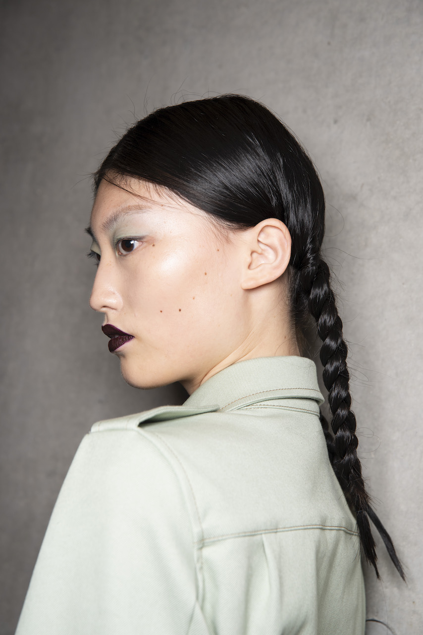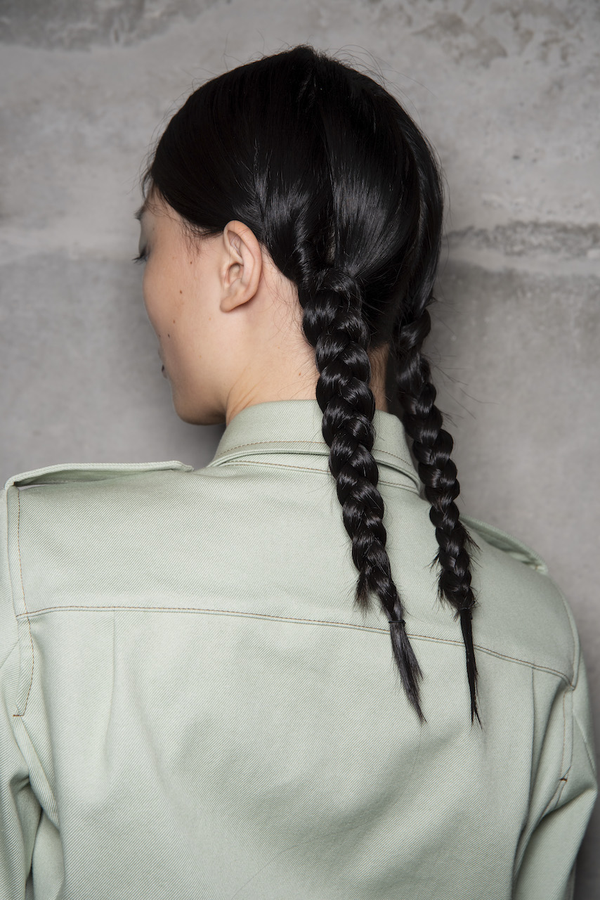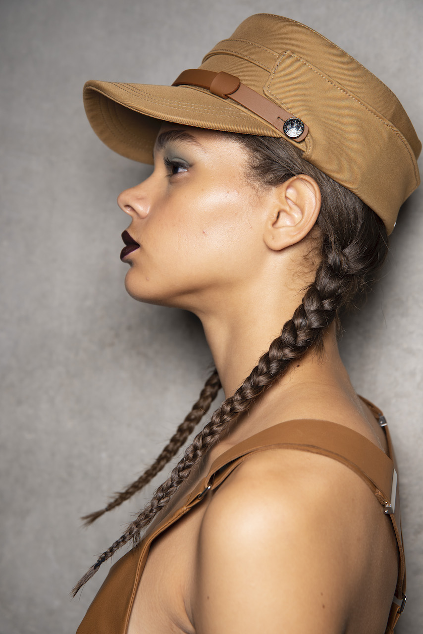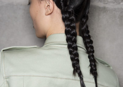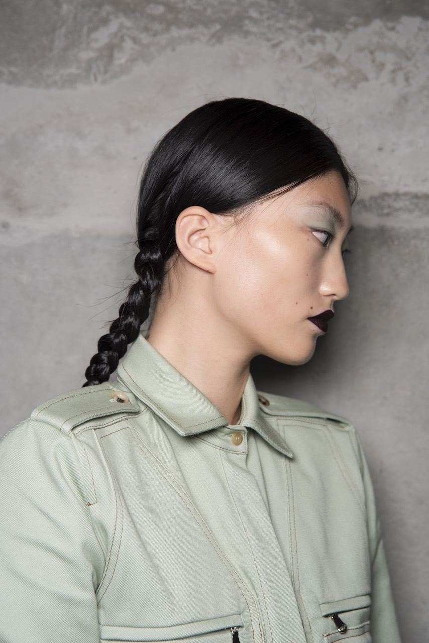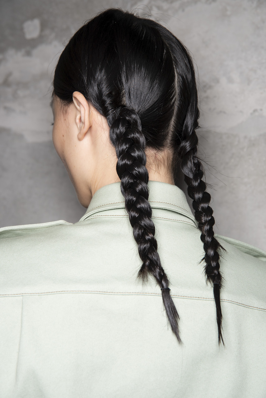 L’hair look ha preso ispirazione da Nova, la rivista politicamente radicale e provocatoria degli anni ’70, che sosteneva il potere delle donne. I capelli sono stati modellati in trecce pratiche e forti, senza cadere sul viso, con un’elegante riga centrale.