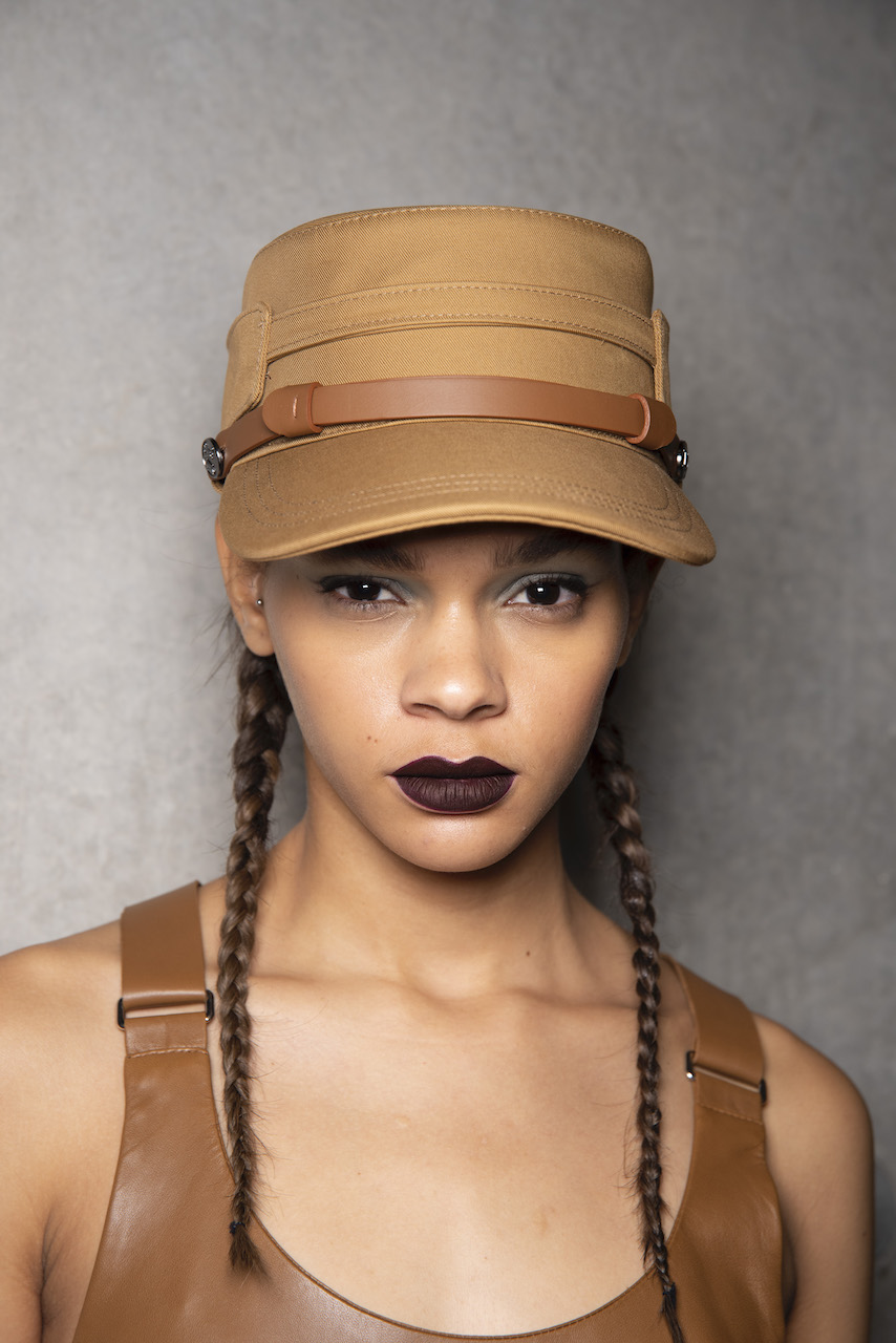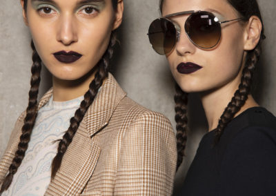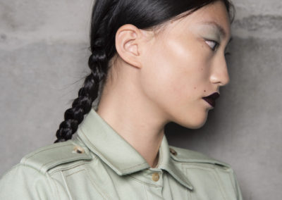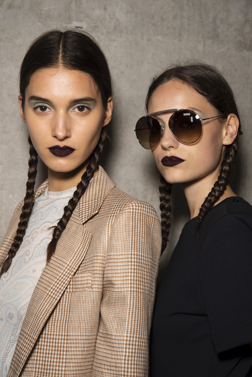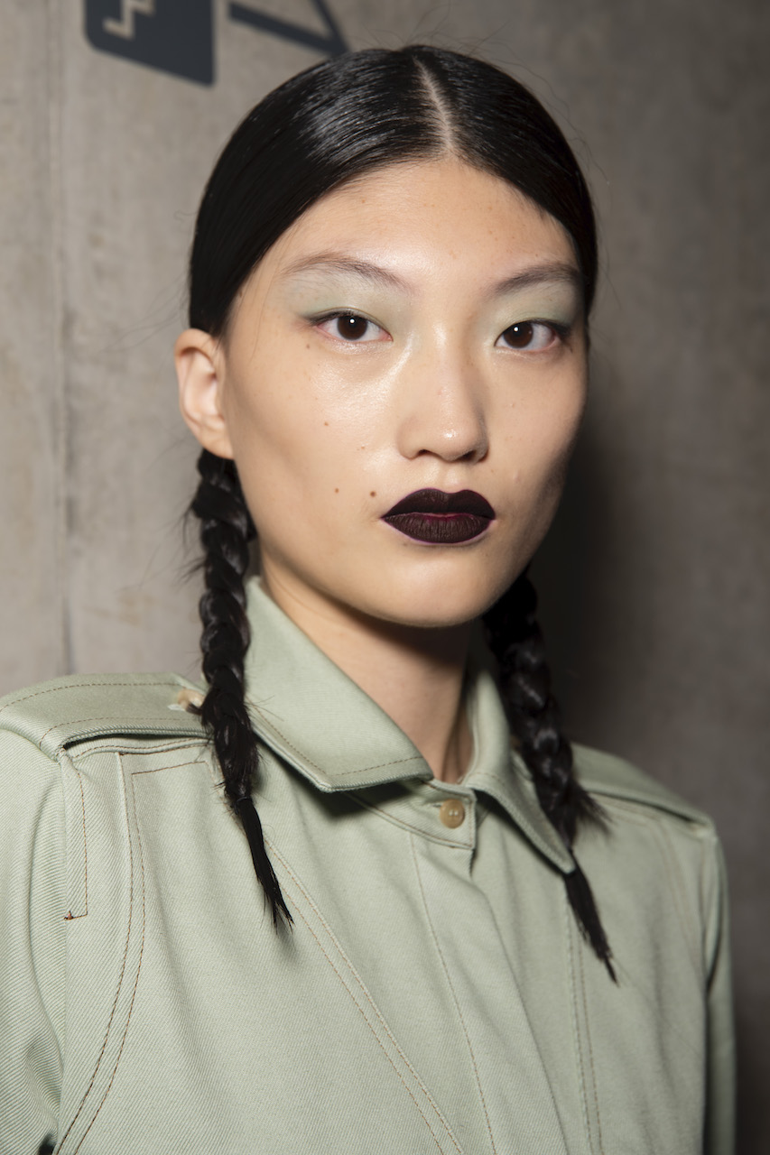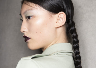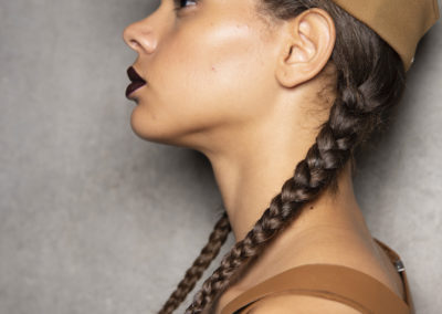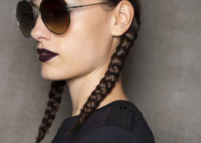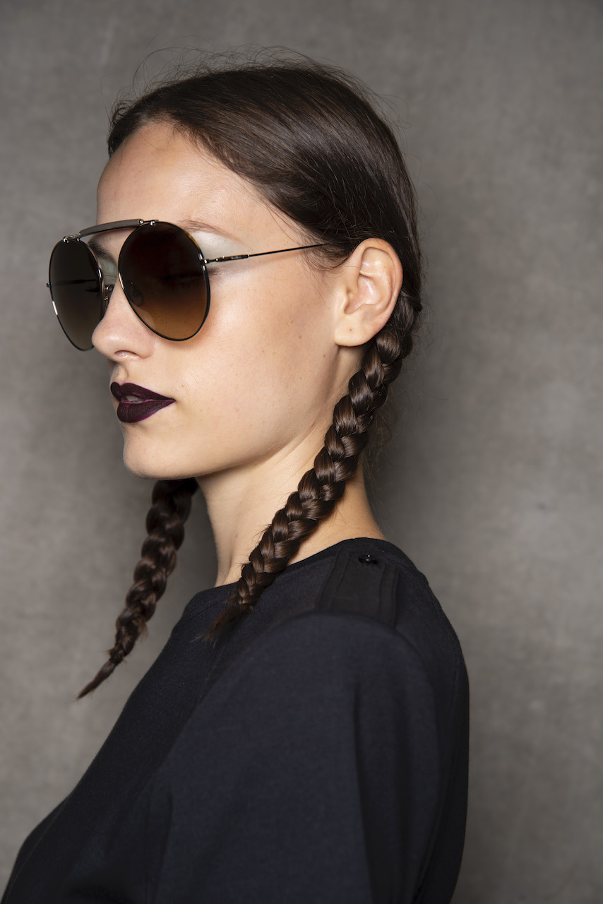 L’hair look ha preso ispirazione da Nova, la rivista politicamente radicale e provocatoria degli anni ’70, che sosteneva il potere delle donne. I capelli sono stati modellati in trecce pratiche e forti, senza cadere sul viso, con un’elegante riga centrale.