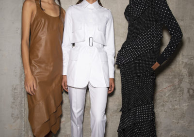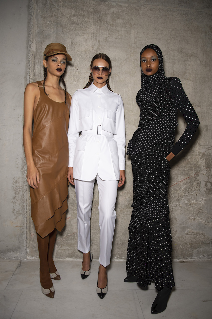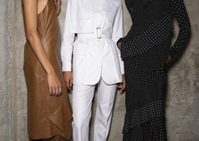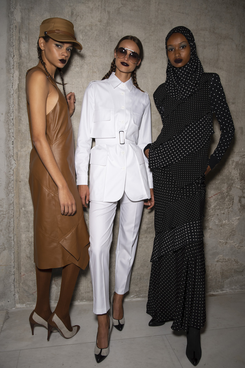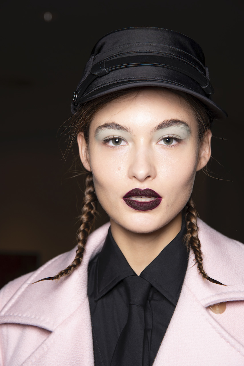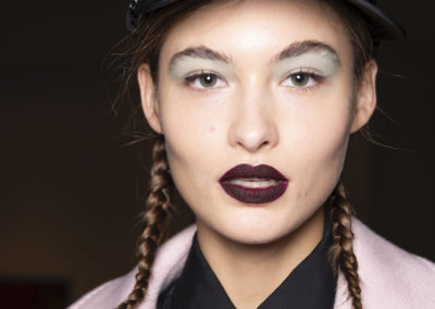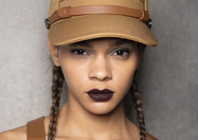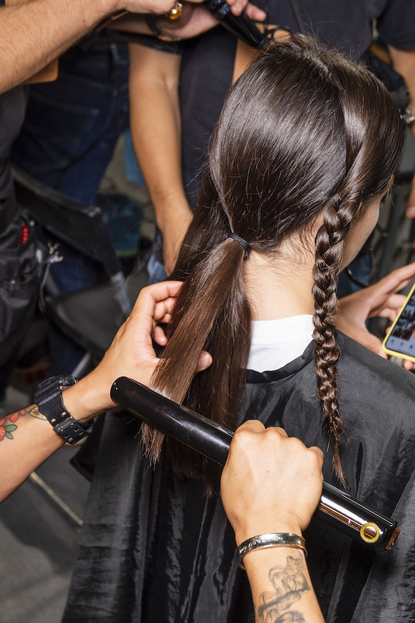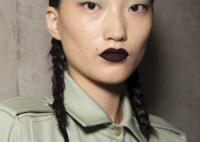 L’hair look ha preso ispirazione da Nova, la rivista politicamente radicale e provocatoria degli anni ’70, che sosteneva il potere delle donne. I capelli sono stati modellati in trecce pratiche e forti, senza cadere sul viso, con un’elegante riga centrale.