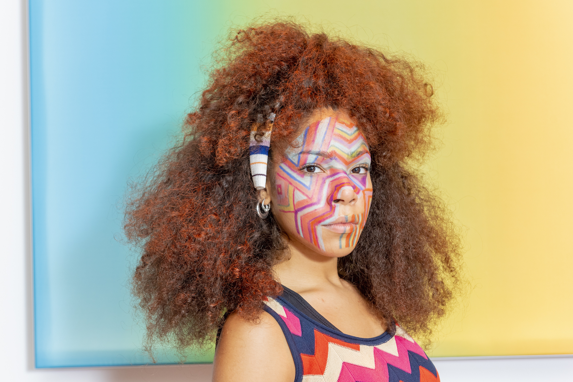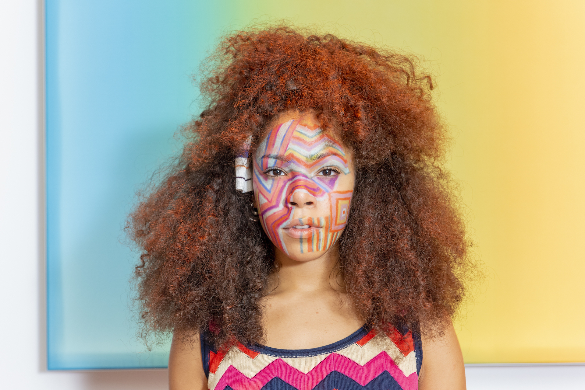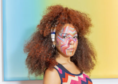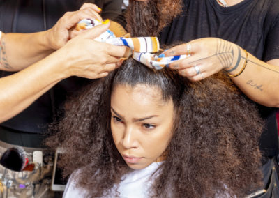 Preparare i capelli con Moroccanoil Dry Shampoo Light/Dark a seconda del colore dei capelli e successivamente applicare una piccola quantità di Moroccanoil Treatment per creare la base perfetta per lo styling. Applicare Moroccanoil Perfect Defense per proteggere i capelli dal calore dello styling e successivamente tirare i capelli per alleggerire la natura afro. Prendere le sezioni di capelli sopra le orecchie, distribuire Moroccanoil Volumizing Mousse e lavorare le ciocche con la spazzola per ottenere un effetto morbido. Con un elastico fissarle in una semi coda di cavallo alta e coprire l’elastico con un nastro della collezione M Missoni.