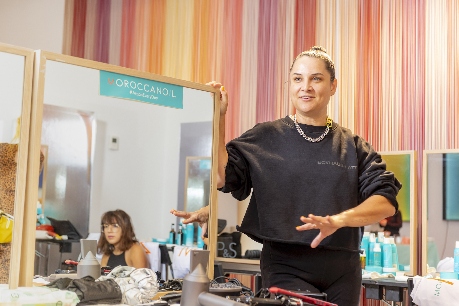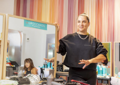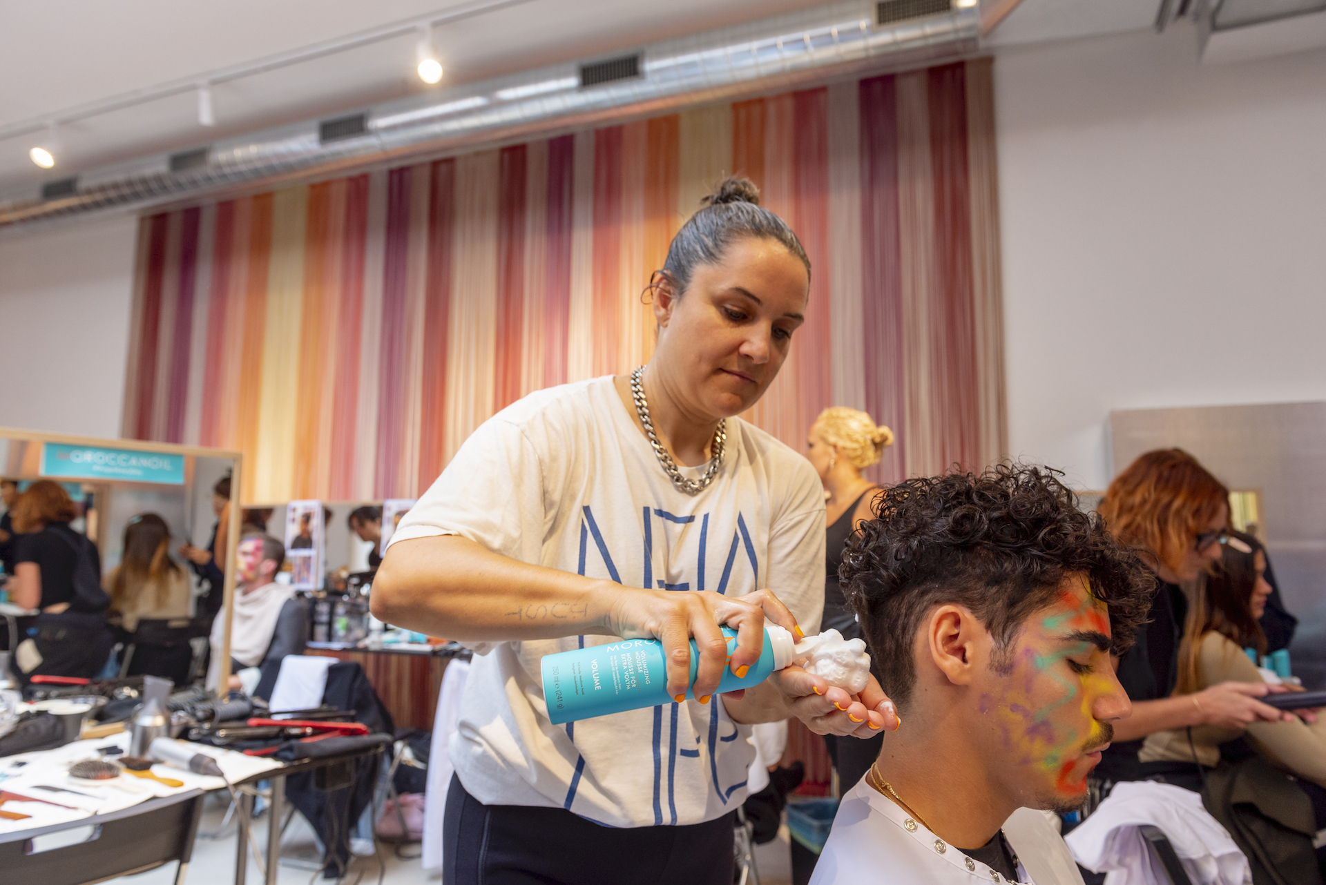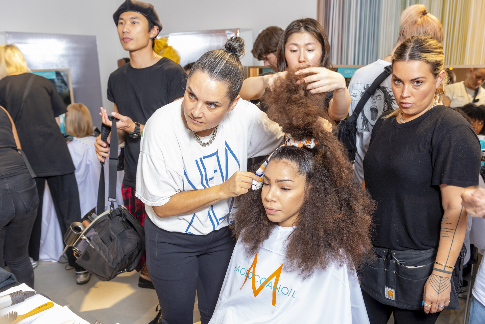 “Per esaltare una presentazione così diversa, con figure così eterogenee abbiamo pensato di creare un look su misura per ciascuno, per declinare ed esaltare le singole personalità, pur mantenendo dei codici comuni” ha dichiarato Holly Smith lead hair stylist per Moroccanoil nel backstage di M Missoni.
