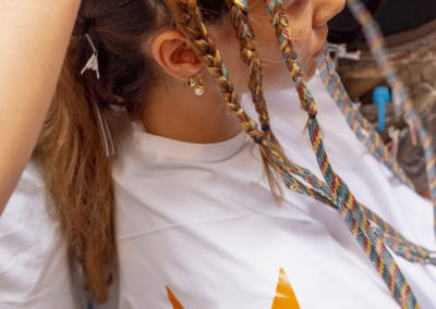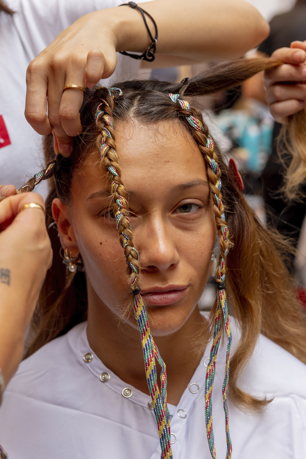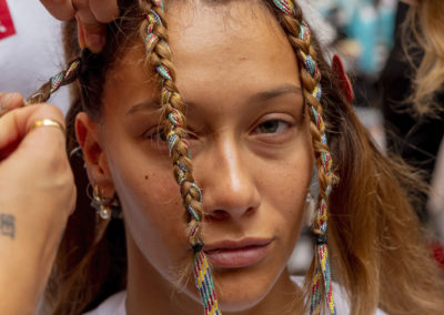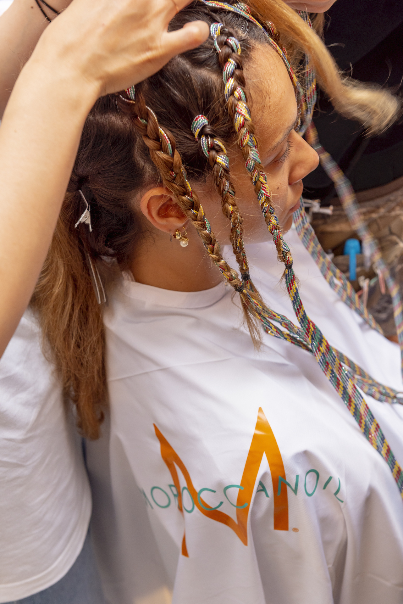 Preparare i capelli con Moroccanoil Dry Shampoo Light/Dark a seconda del colore dei capelli e successivamente applicare una piccola quantità di Moroccanoil Treatment per una base perfetta, idratata e pulita. Per conferire struttura, applicare su tutta la capigliatura Moroccanoil Texture Clay, distribuendolo su ogni ciocca dalle radici fino alle punte. Intrecciare ciascuna ciocca inserendo una striscia di stoffa M Missoni per personalizzare l’acconciatura. Concludere rifinendo le estremità di ciascuna treccia con Moroccanoil Blow Dry Concentrate e Moroccanoil Smoothing Lotion.