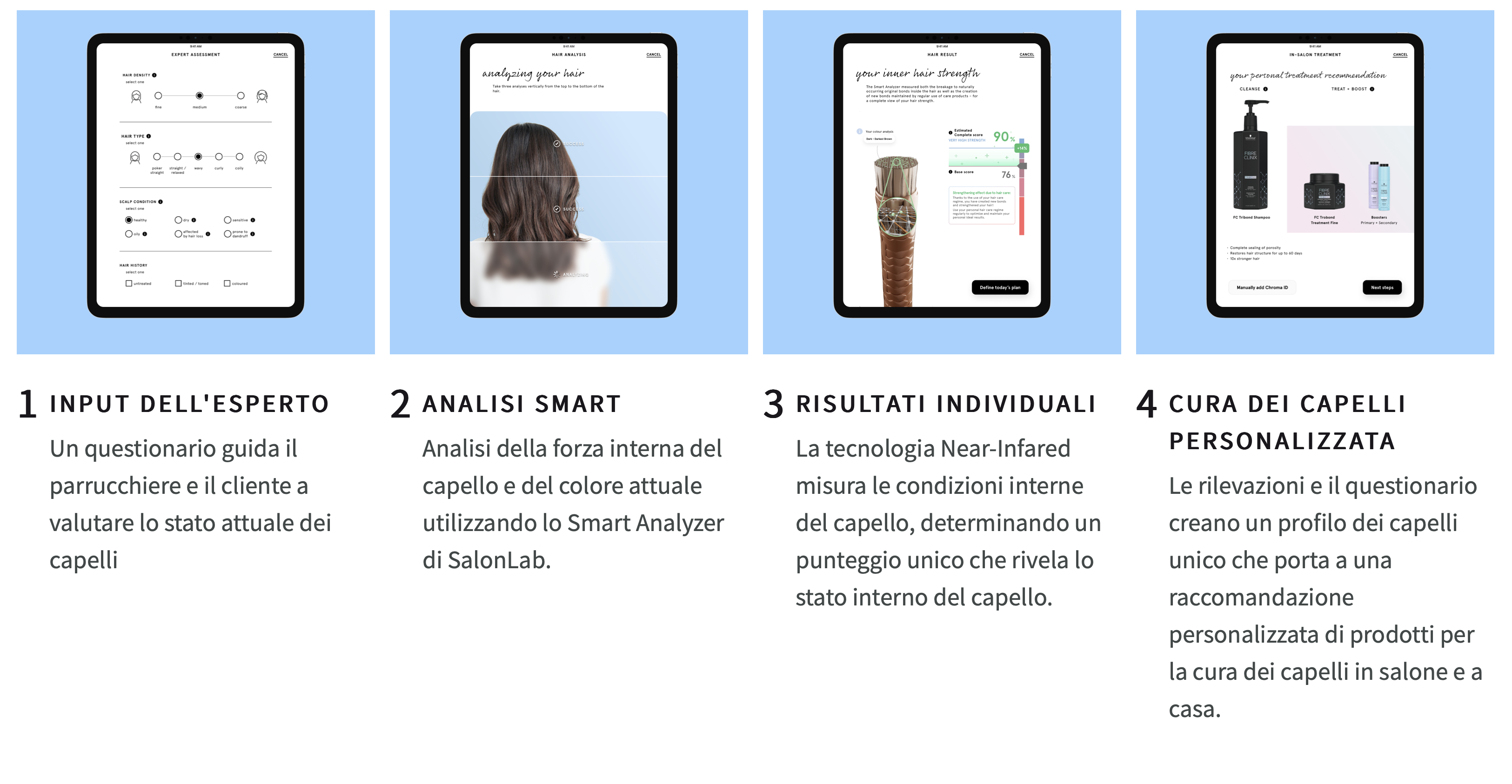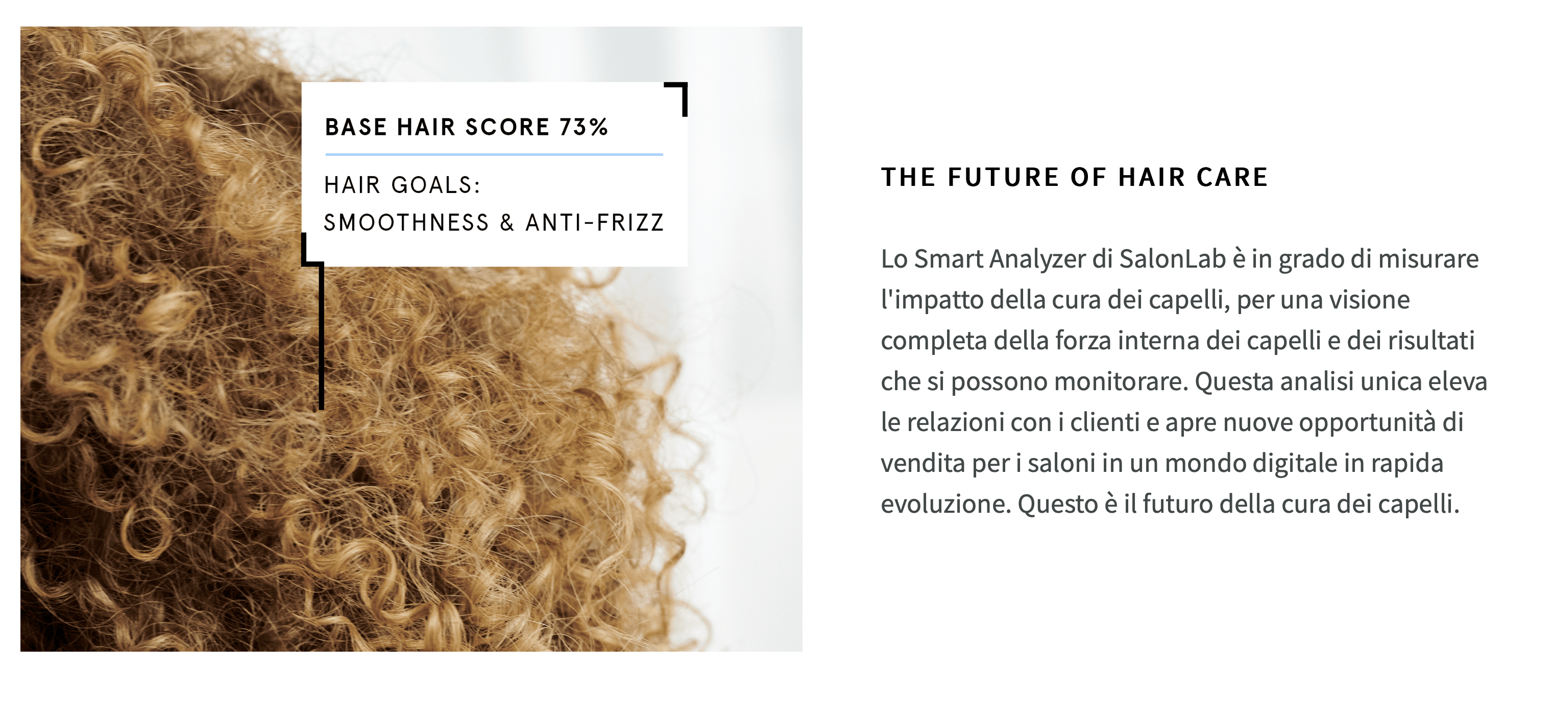 Il Salon Lab è uno strumento professionale che si basa su dati scientifici affidabili. È collegato a un’app che consente una diagnosi iniziale e la creazione di report personalizzati per i clienti. Grazie a questa tecnologia, il professionista può inserire dati visivi per un’analisi dettagliata e una valutazione precisa. I parametri come il tipo di capelli, la densità e le condizioni del cuoio capelluto sono personalizzabili.