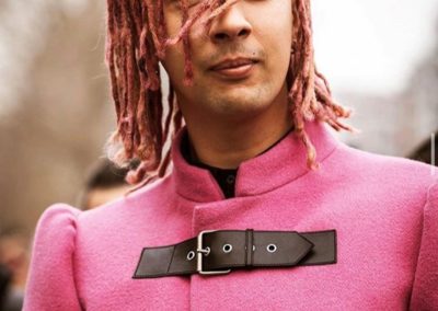 al cappotto rosa shocking, infatti, ha abbinato dei dred in tinta, risultato del sapiente lavoro del colorista Lucio Ocria, titolare del salone Glow Hair Beyond in via Mascheroni a Milano.