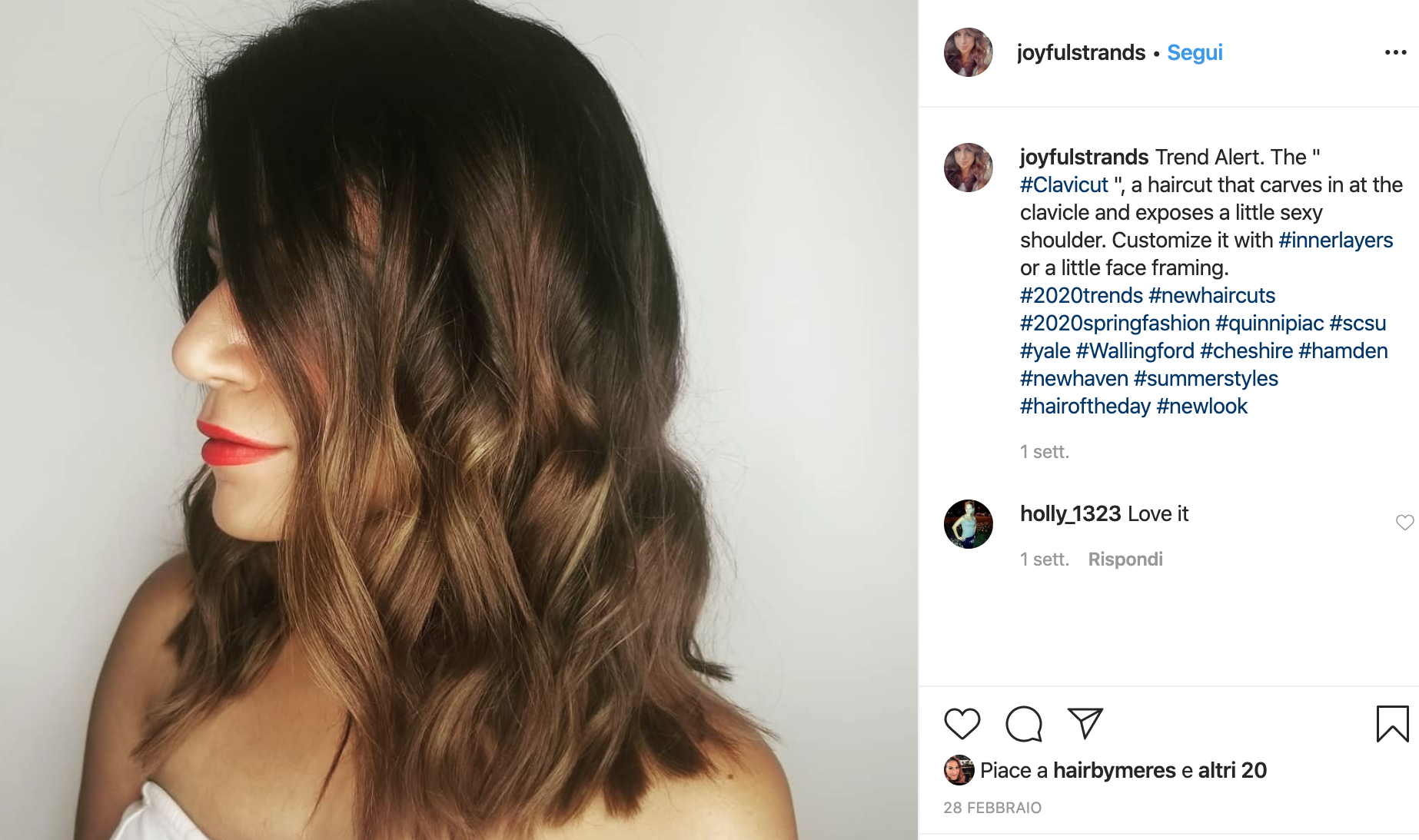 Si tratta del caro taglio alle clavicole, quindi siamo nelle lunghezze medie, che ormai sappiamo essere il trend assoluto del 2020, che permettono ancora di raccogliere i capelli con una coda ma rendono evidente che si è data una rinfrescata al look.