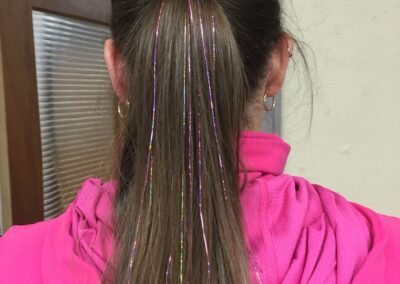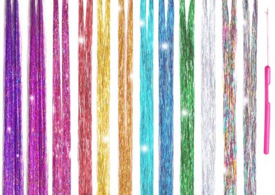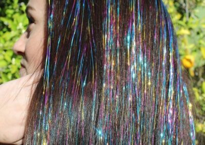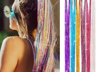 Esistono diverse tipologie di Tinsel Hair con diversi metodi di applicazione specifico. Alcuni, infatti, possono essere attaccati alla chioma attraverso delle semplici bande adesive, mentre altri possono essere legati a uno a uno con un nodo. Un lavoro che, come potete immaginare, richiede delle mani esperte, quindi sempre meglio ricorrere all’aiuto del parrucchiere.