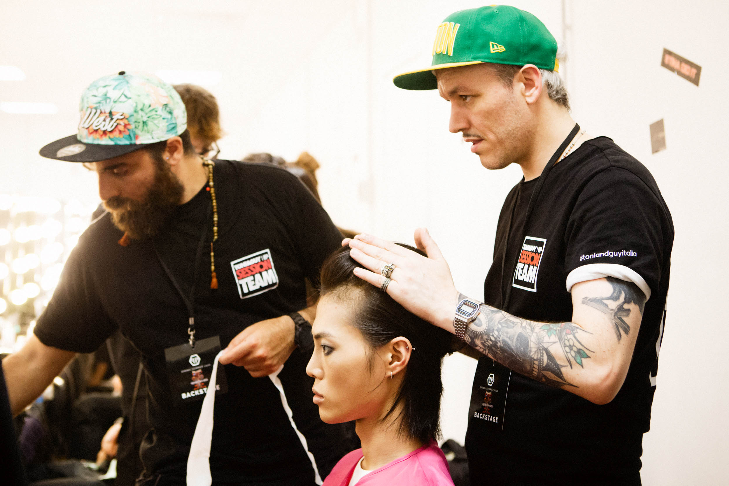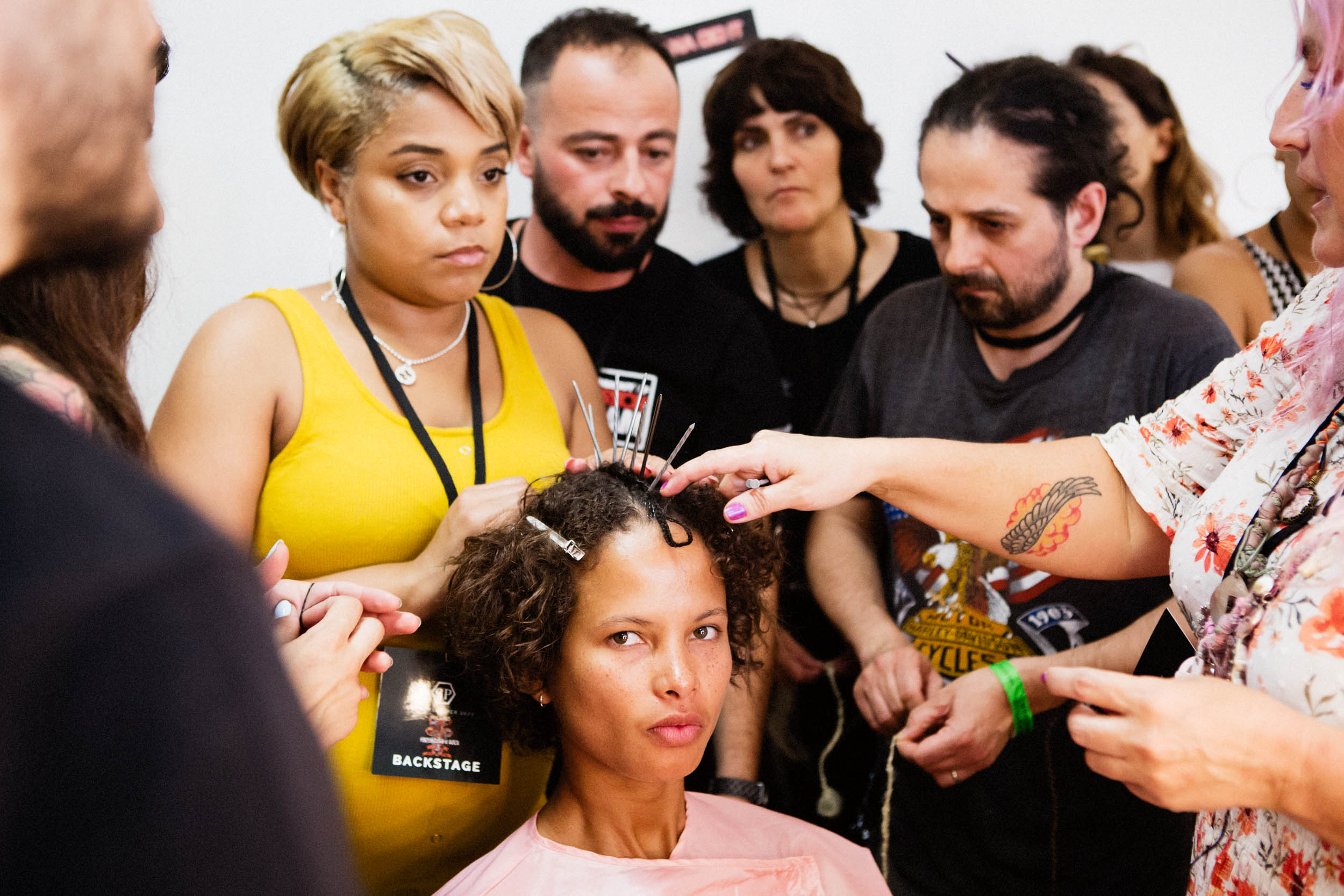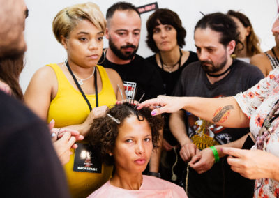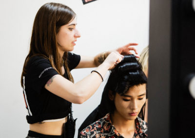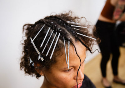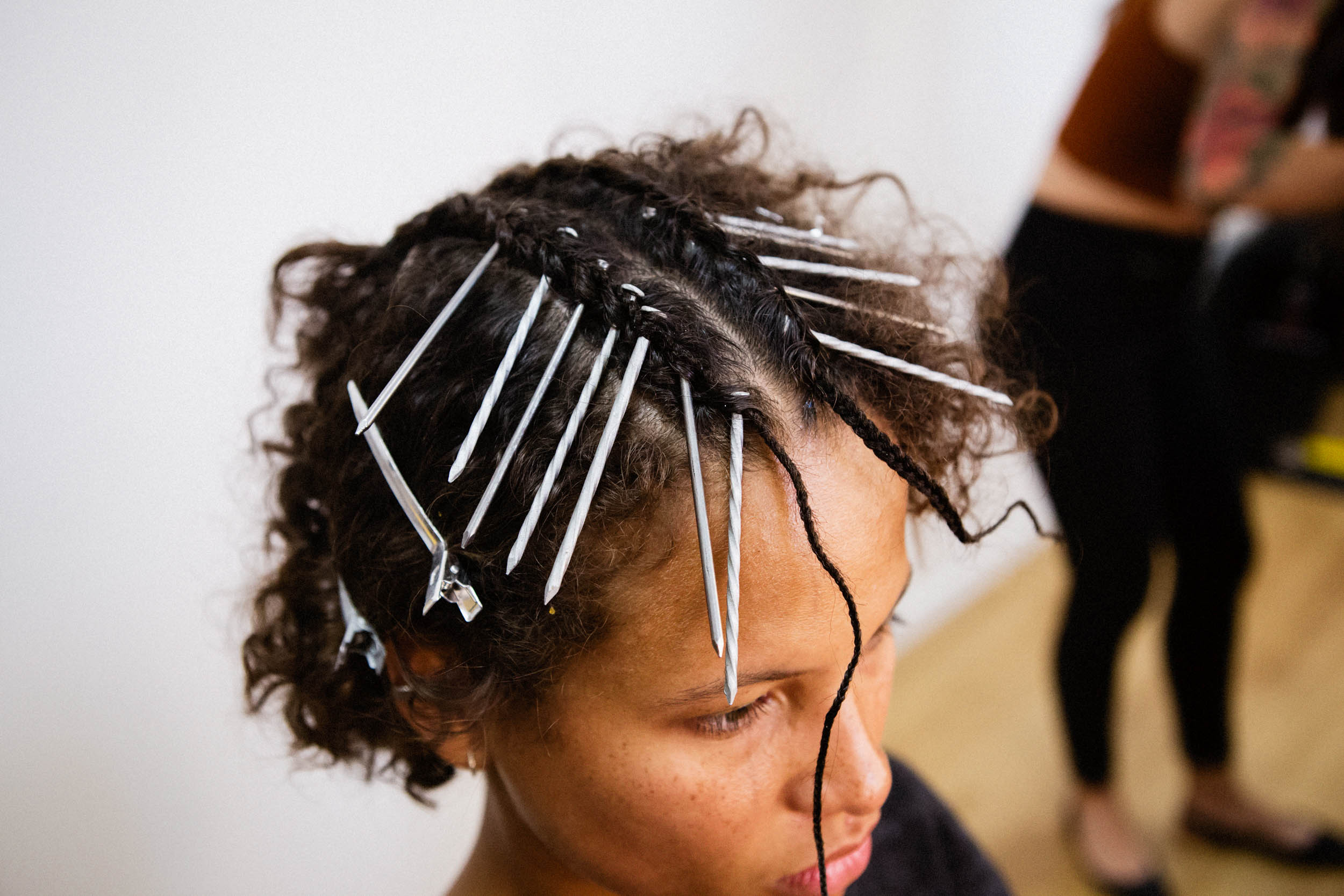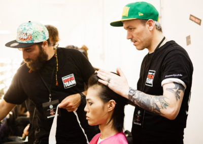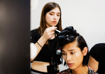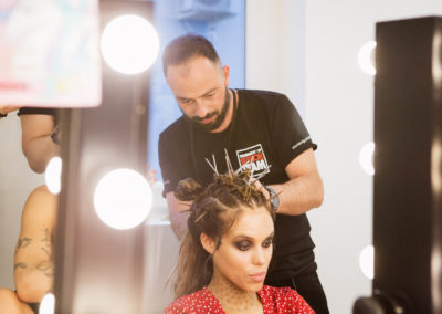 Nel primo look donna, sono stati infilati dei chiodi nelle trecce delle ragazze. Le trecce sono state poi incrociate tra di loro e fissate all’interno dei capelli. I chiodi sono stati applicati in maniera importante e visibile, per richiamare in maniera decisa il film Mad Max. Ciascuna modella aveva dalle due alle quattro strisce di trecce piene di chiodi. In questo look, l’acconciatura è stata fissata con la label.m Extra Strong Mousse e moltissimo gel come tocco finale, per dare un effetto dirty. Anche se il riferimento era lo stesso per tutti, ciascun look è stato lavorato in modo personalizzato.
