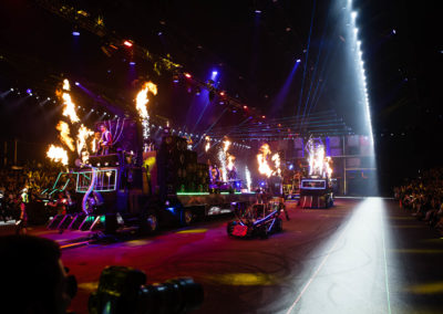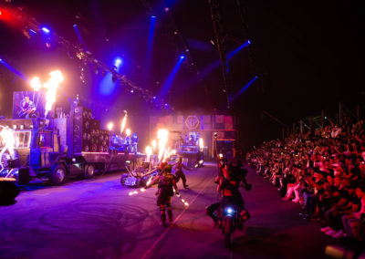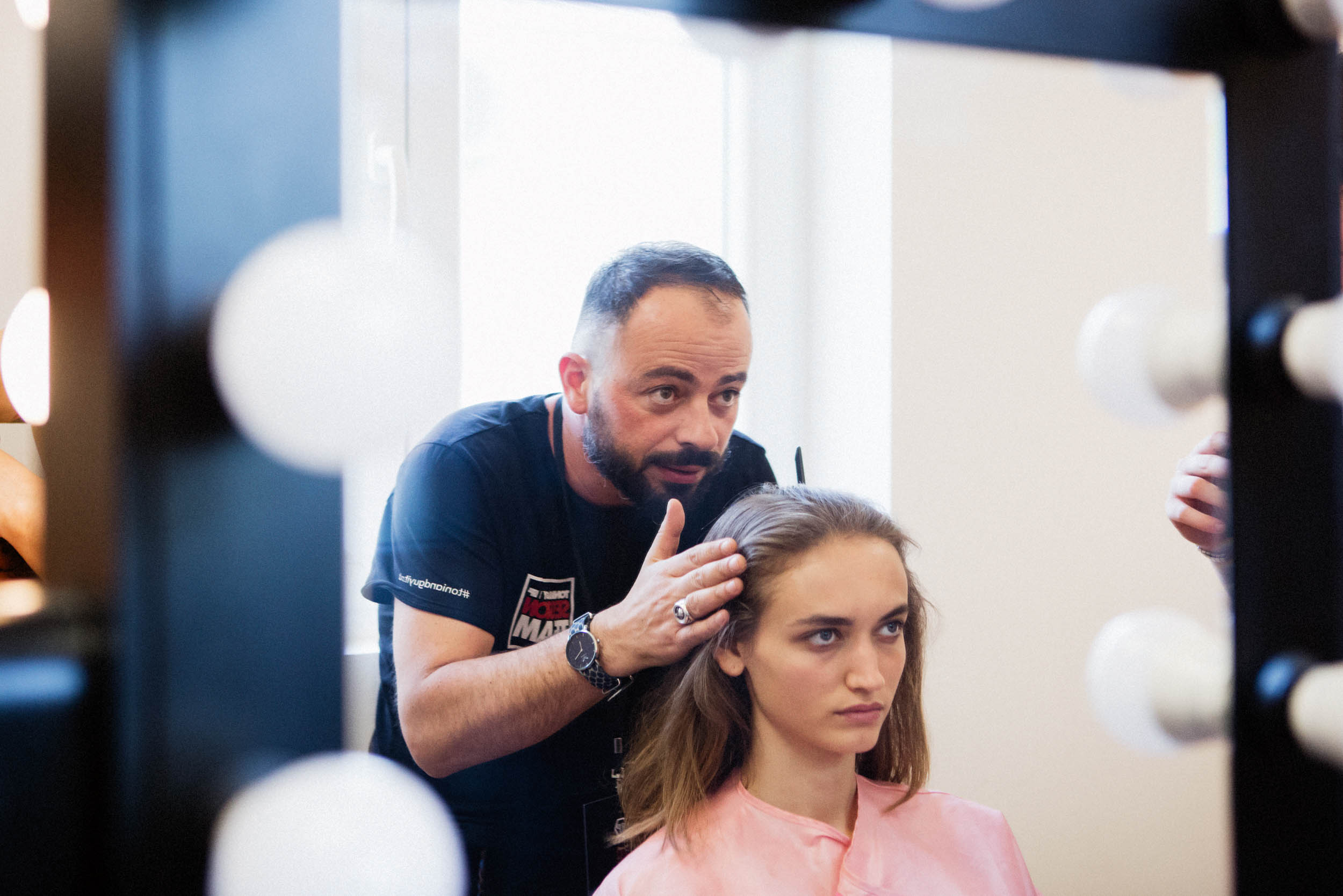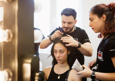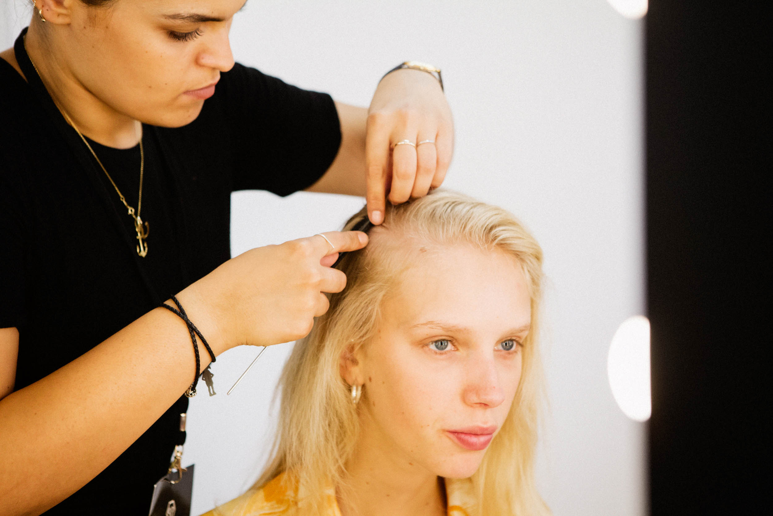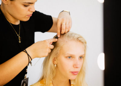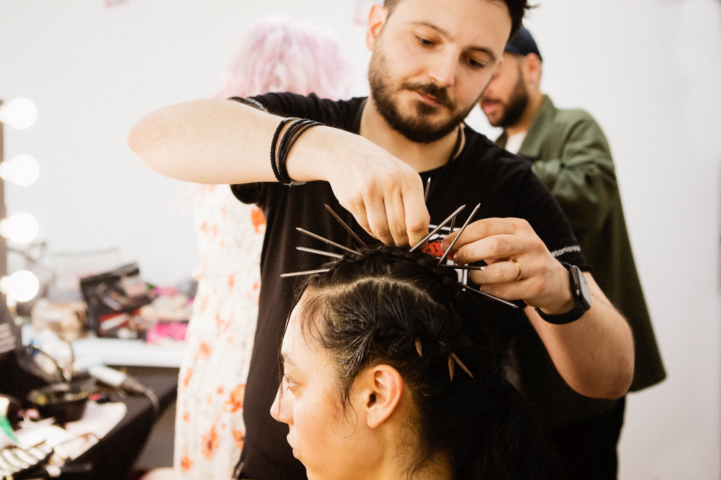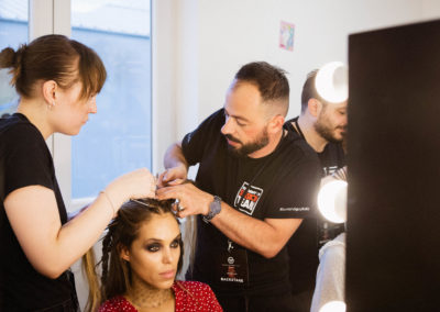 Nel primo look donna, sono stati infilati dei chiodi nelle trecce delle ragazze. Le trecce sono state poi incrociate tra di loro e fissate all’interno dei capelli. I chiodi sono stati applicati in maniera importante e visibile, per richiamare in maniera decisa il film Mad Max. Ciascuna modella aveva dalle due alle quattro strisce di trecce piene di chiodi. In questo look, l’acconciatura è stata fissata con la label.m Extra Strong Mousse e moltissimo gel come tocco finale, per dare un effetto dirty. Anche se il riferimento era lo stesso per tutti, ciascun look è stato lavorato in modo personalizzato.