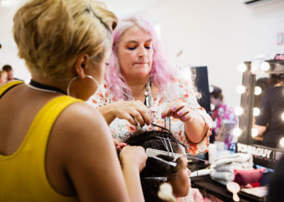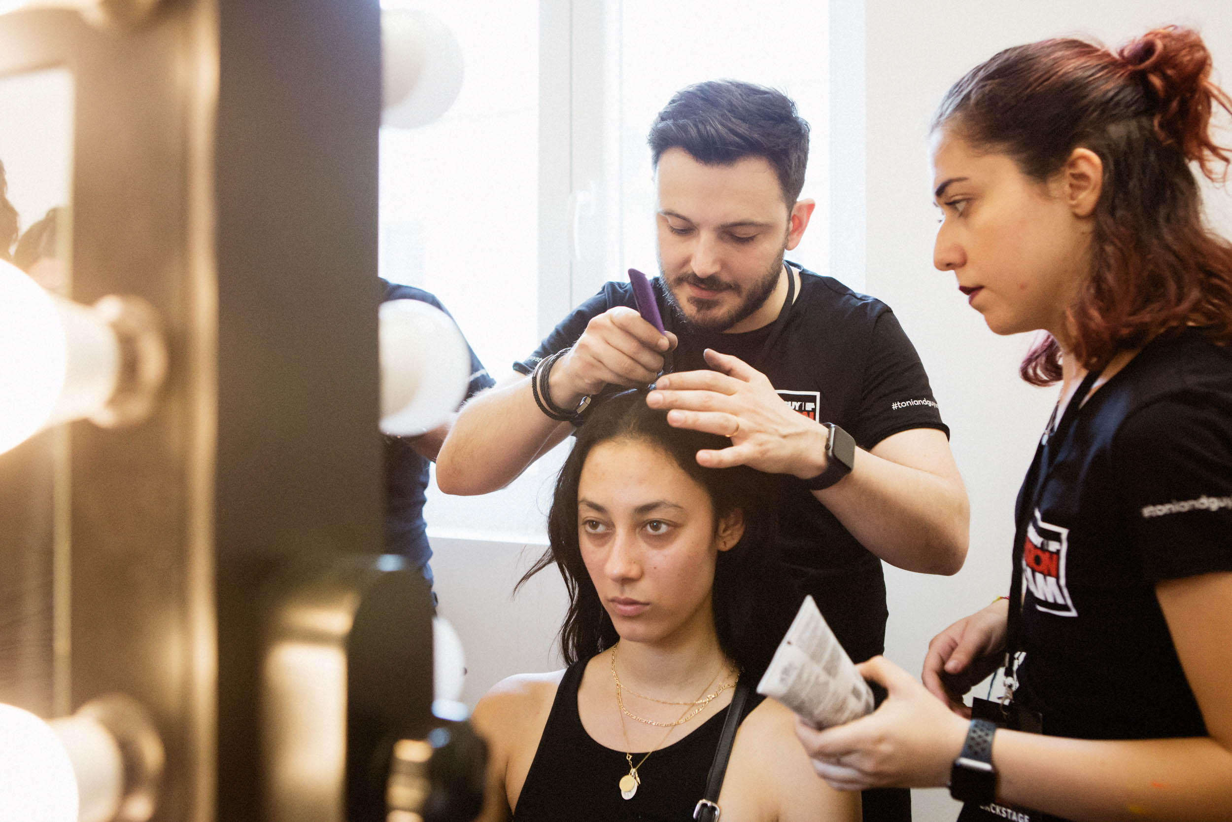 Il secondo look donna si è ispirato invece alla rock band Kiss: nelle chiome delle modelle vediamo la riga laterale, molto bassa, lavorata con la label.m Extra Strong Mousse. Si è voluto dare moltissimo volume e moltissimo movimento al capello, usando il ferro in maniera individuale e creando così un’onda molto irregolare, quasi destrutturata. La parte laterale della testa è stata poi lavorata in modo da schiacciare i capelli all’indietro e nascondendo la coda sotto ai capelli sciolti, utilizzando la label.m Hair Glue.