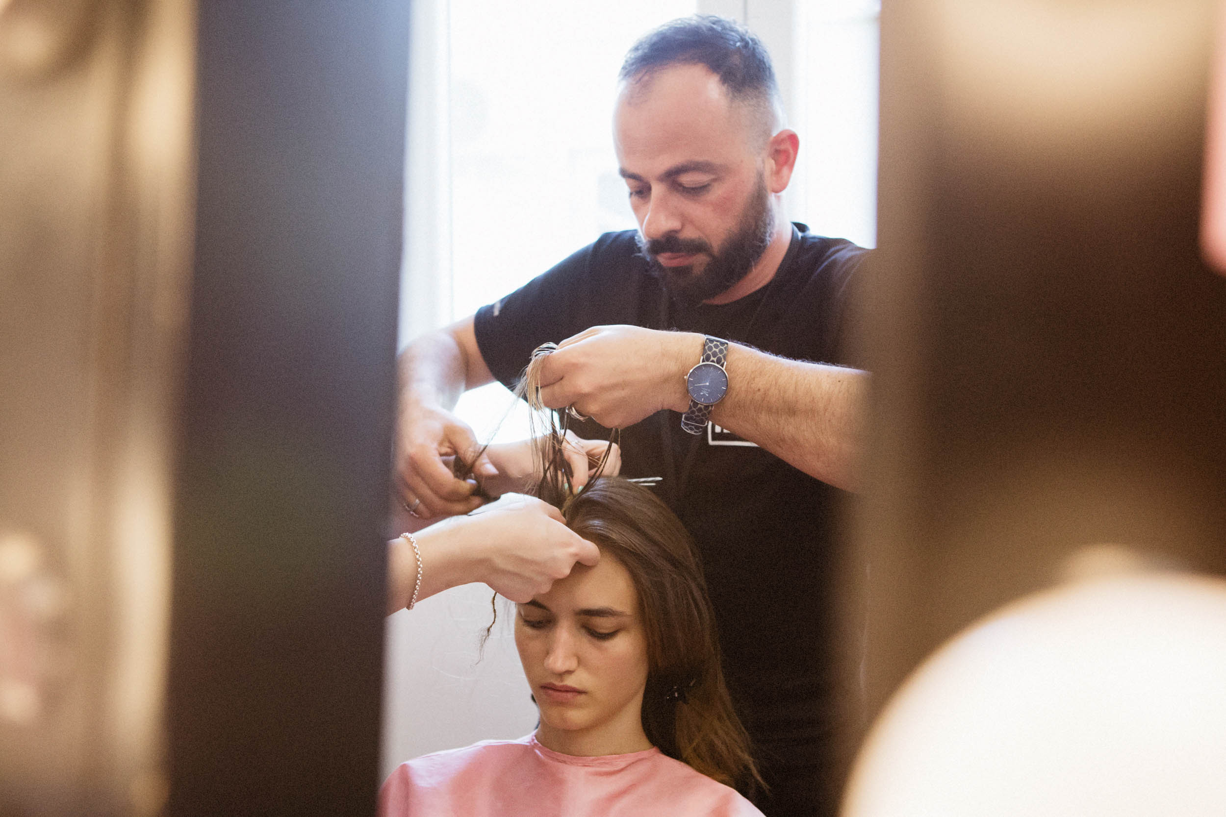 Nella parte superiore è stato utilizzato anche moltissimo gel, per un effetto wet, senza però abbassare il volume dei capelli. La sezione laterale, invece, è stata lavorata con la label.m Hair Glue per schiacciare molto e replicare il “Don’t Cry” look dell’attore americano.