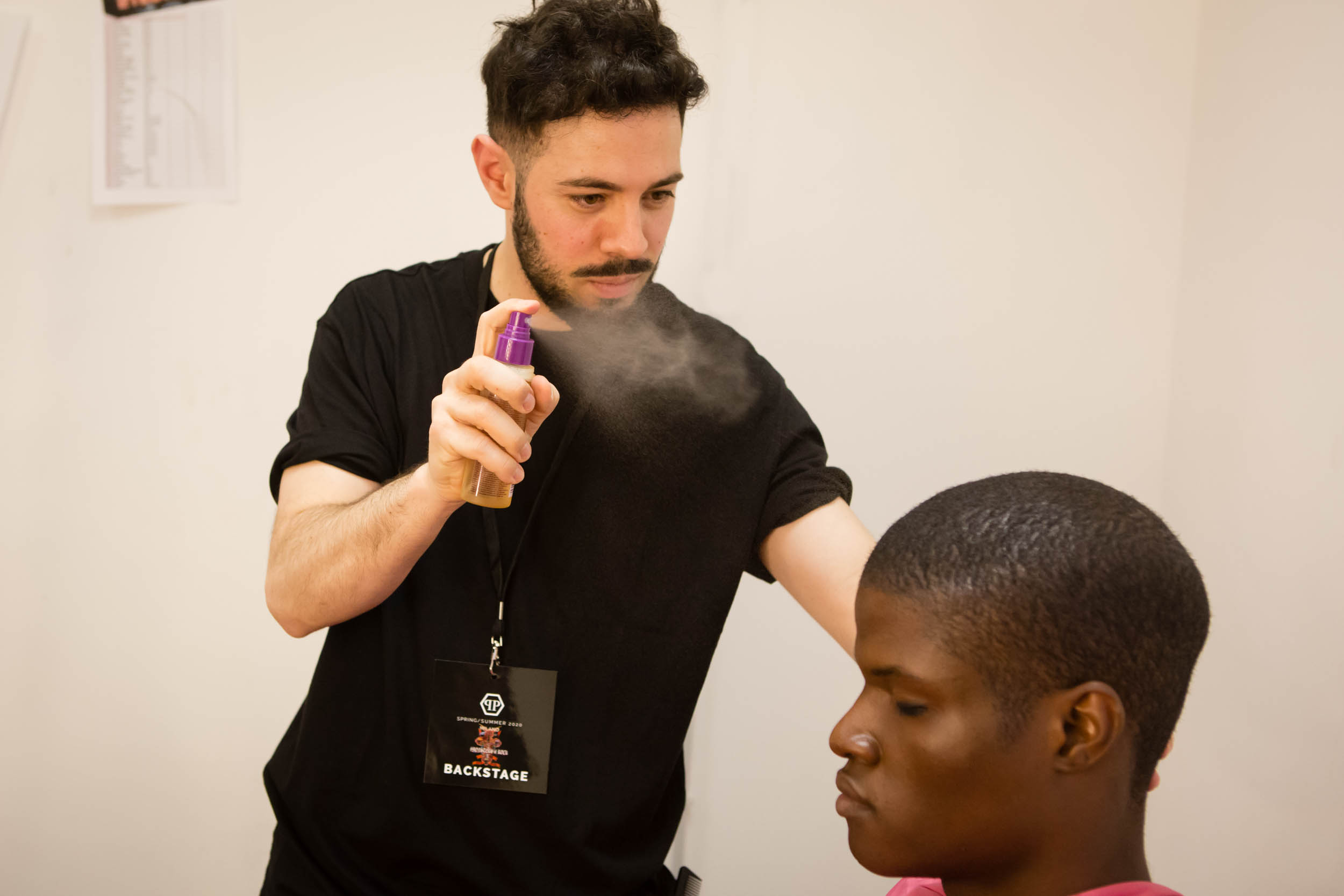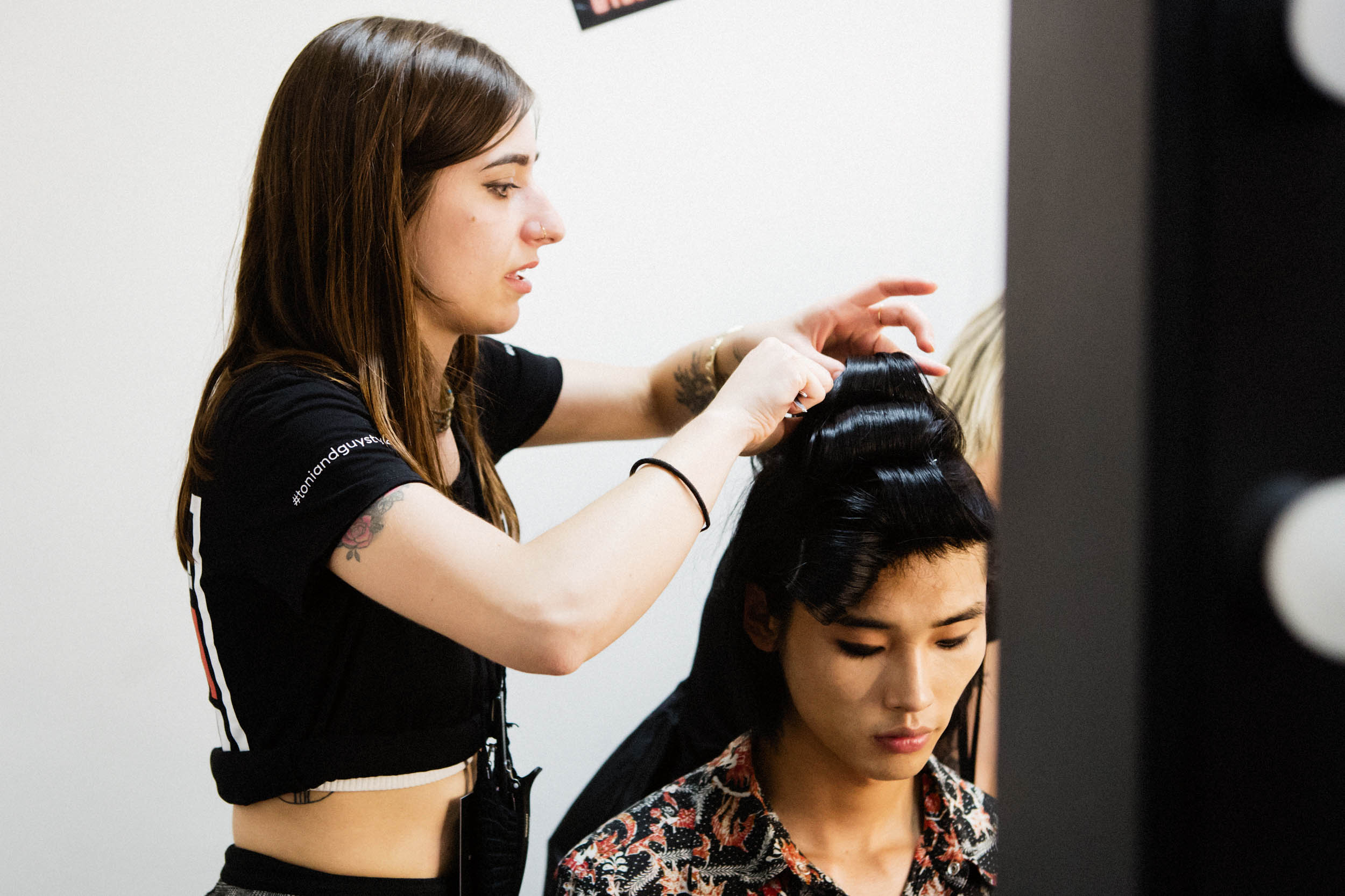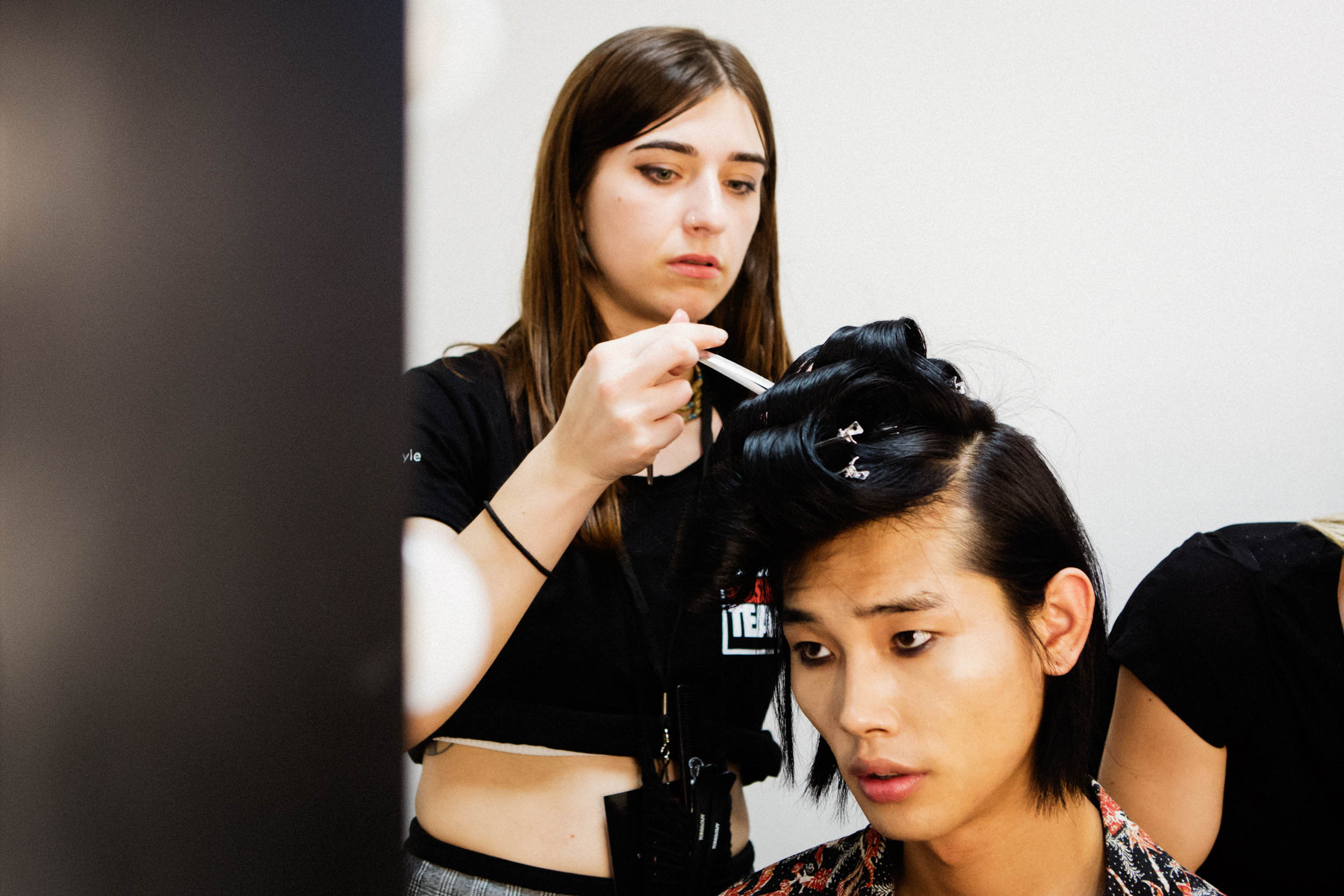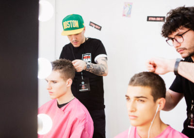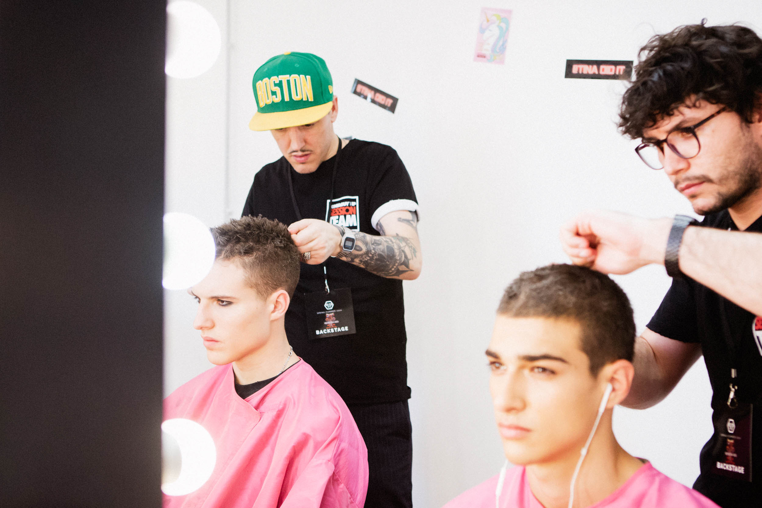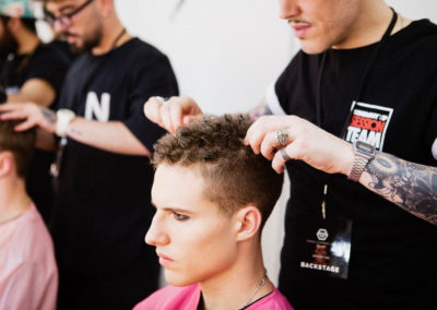 Label.m Hair Glue e label.m Sea Salt Spray sono stati usati per individuare le ciocche dei capelli ed attorcigliarle, creando così dei chiodi di capelli, con una tessitura estremamente “sporca”, irregolare e vissuta. Su alcuni ragazzi con taglio lungo, il look naturale è stato portato all’esagerazione, attraverso l’applicazione di label.m Anti-frizz Cream sulle punte ed aggiungendo del movimento al capello, tramite l’uso del ferro.
