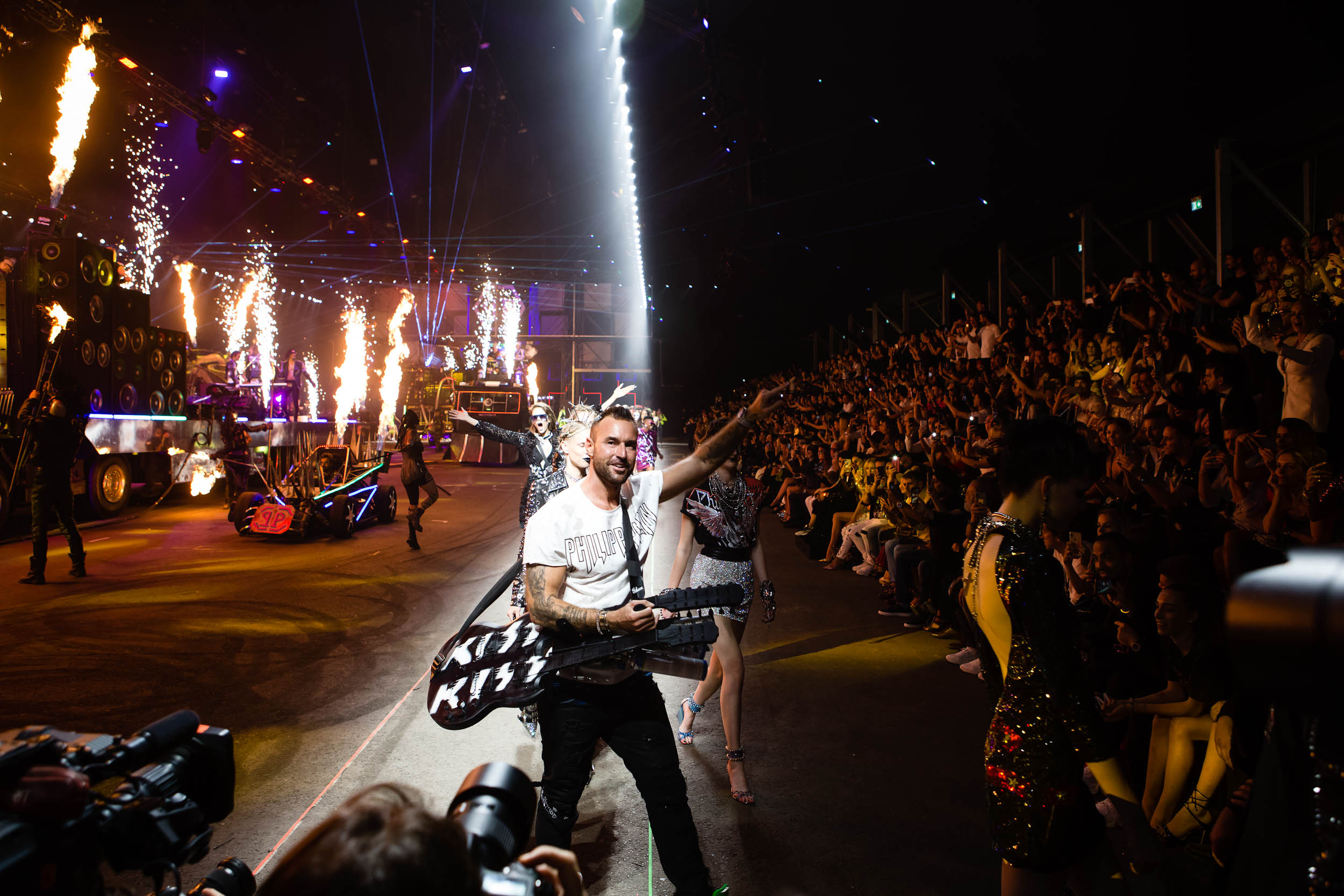 Lo stilista svizzero ha voluto rendere omaggio ai Kiss, mandando in passerella modelli e modelle col caratteristico trucco nero su bianco, da sempre segno distintivo della rock band. Ma non solo: la sfilata ha forti richiami anche al film Mad Max.