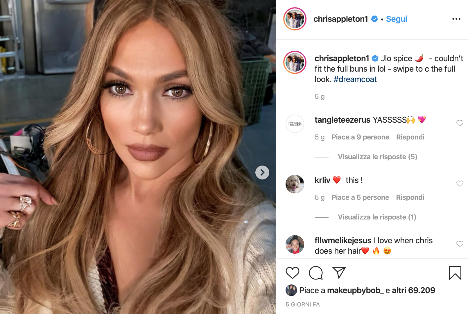 Come sempre è Chris Appleton, hairstylist di JLo e di tante altre celeb a mostrarci il lavoro appena sfornato, un mix di colori caldi, dal castano chiaro al biondo caramello.