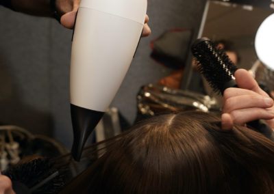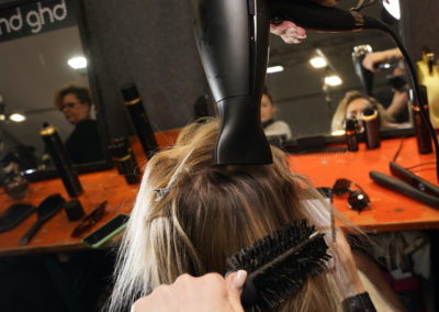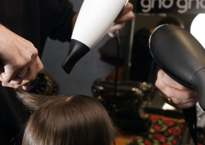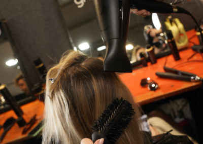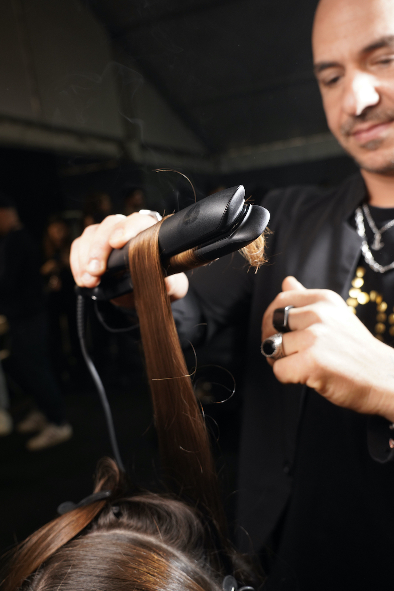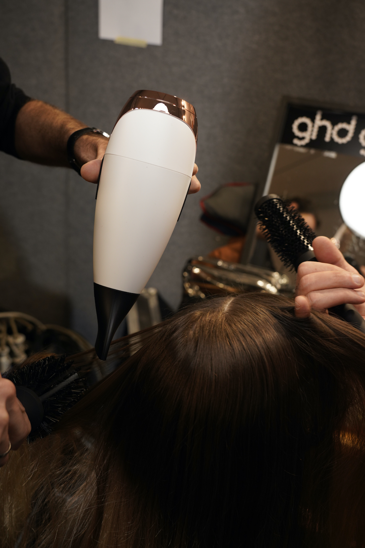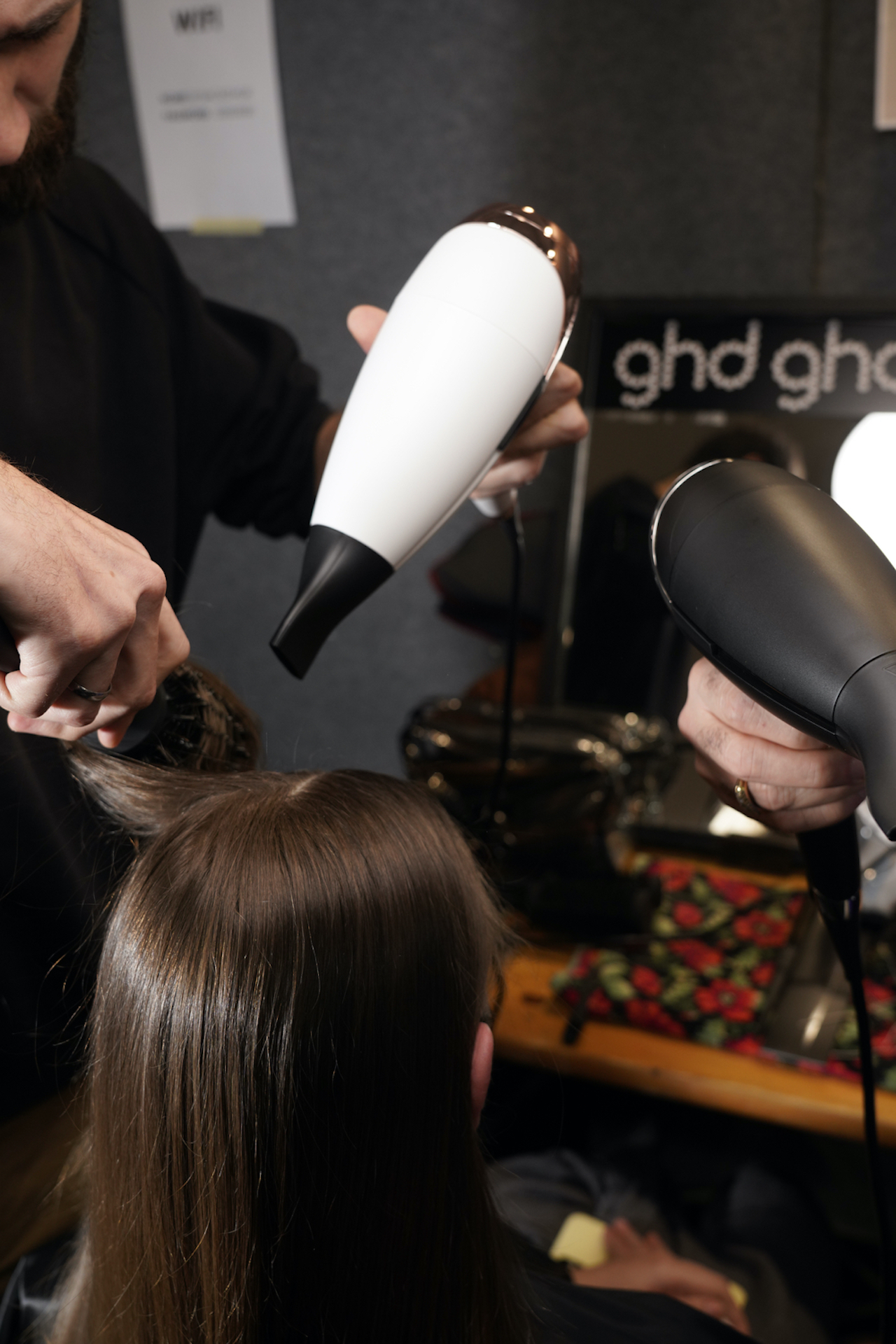 Peter Gray e il team di hairstylist ghd hanno creato un look raffinato ed elegante, con una twist ponytail. Per realizzare il look della sfilata, gli hairstylist hanno preparato i capelli con ghd heat protector e straight & smooth spray e, successivamente li hanno divisi in sezioni, sempre applicando straight & smooth spray. Poi hanno proseguito con l’asciugatura utilizzando ghd natural brush e ghd helios il nuovo asciugacapelli professionale di ghd. Grazie al beccuccio sagomato il flusso d’aria ad altissima velocità viene direzionato in modo ultra preciso, per modellare il capello appiattendo al massimo i volumi e ottenere un look super liscio ed extra lucente.