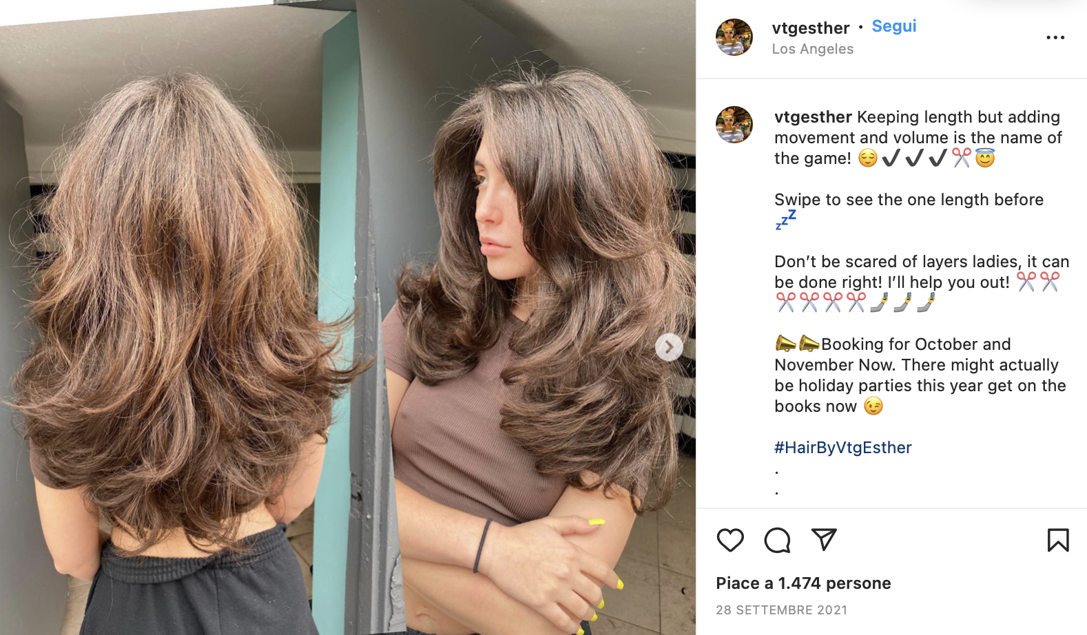 In sostanza, tutta la freschezza di un taglio medio-corto ma traslata sul lungo: si parte da una frangia tendenzialmente a tendina e da lì si prosegue con il sfilare i capelli, che creano una cornice intorno al viso mentre mantengono il massimo del volume e movimento. Se raccolti, per esempio, sembra quasi che i capelli siano davvero corti, ottenendo un fake bob con il minimo sforzo, potendo così cambiare look tutte le volte che si vuole, senza rinunce. L’ispirazione di questo taglio estremamente attuale sono ovviamente gli Anni 70 e tutti i suoi derivati, molto di tendenza in queste ultime stagioni. Si possono notare alcune influenze dello shag, che sposta tutta in avanti la scalatura della chioma, in questo caso rivista in maniera più morbida e fluida.