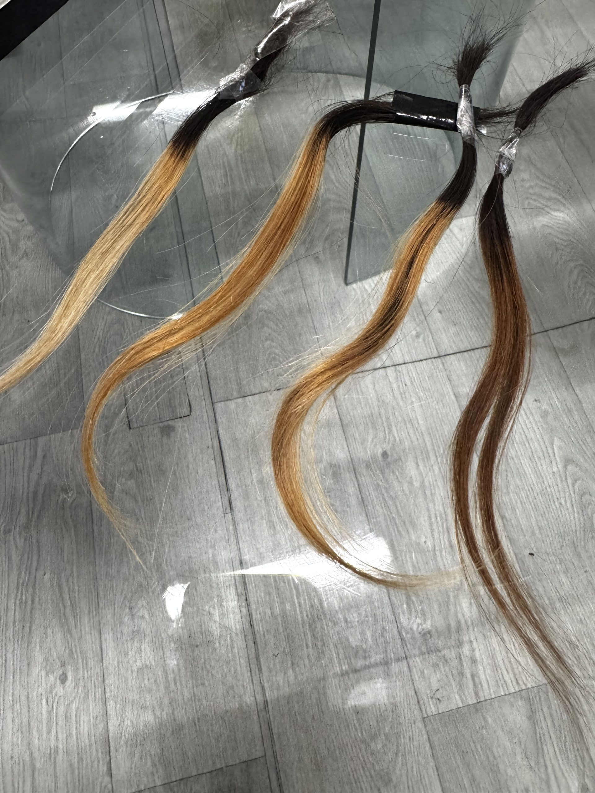 2. Seconda ciocca: Decolorante applicato 30 minuti dopo la preparazione. La schiaritura è leggermente meno intensa, ma ciò che emerge è la comparsa di lievi barrature, nonostante l’applicazione sia stata eseguita con precisione.