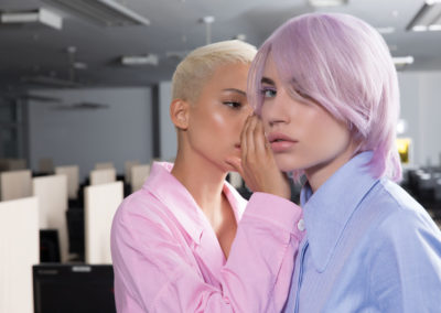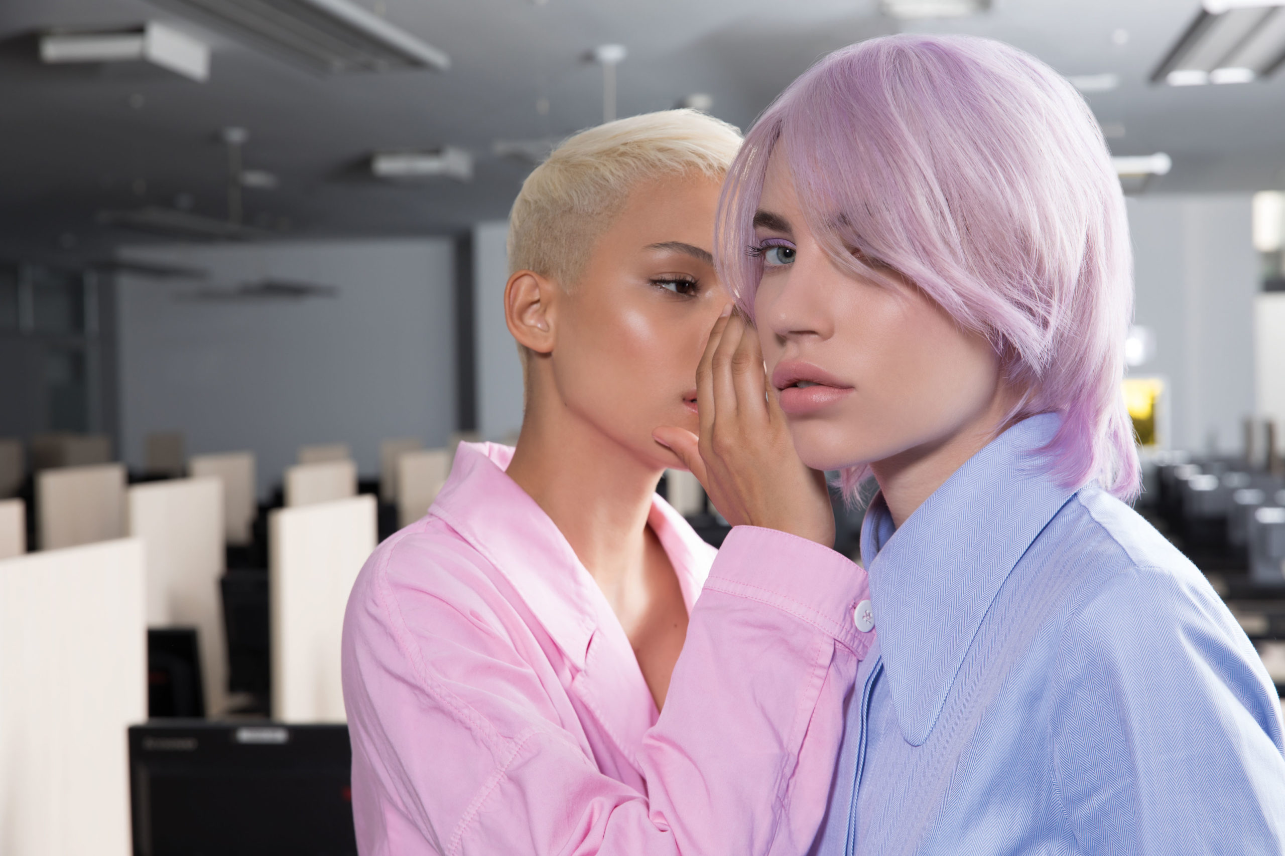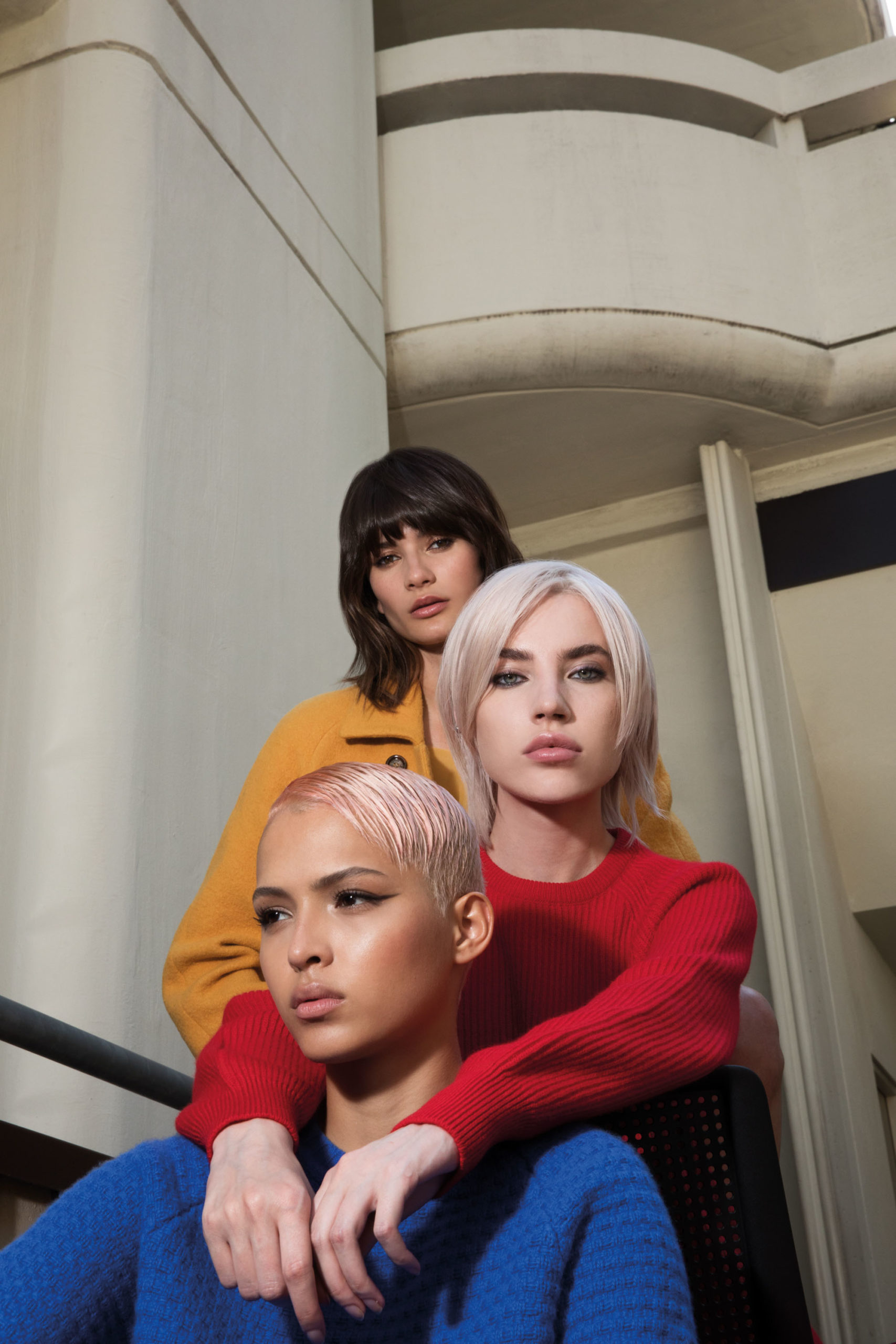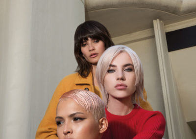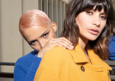 Il secondo mood, Duty , presenta invece una bellezza peculiare, per riflettere sui canoni classici a cui ci siamo ispirati nel tempo, ridefinendoli attraverso un approccio più fluido, inclusivo. Il luogo di lavoro è una passerella dove valorizzare il proprio look senza dimenticare lo spirito di aggregazione, non per essere al di fuori del gruppo, ma per renderlo più forte. Sugli abiti, i colori sono accesi: il rosa, l’azzurro e l’ocra si intensificano virando sul rosso, il blu e l’arancio. Le forme invece sono morbide, evocando il comfort più totale, ma allo stesso tempo esaltano la femminilità 2.0, senza bisogno di esporre, ma valorizzando elegantemente l’essere. I capelli sono attori primari all’interno di questo stile, senza bisogno di imporsi, ma sottolineando una voglia di sperimentazione più o meno ardita. I fondi biondo ghiaccio offrono la possibilità di osare con i pastelli: delicati baby lavanda e rosa pesca; i marroni più intensi di inserire punti luce che armonizzino i lineamenti, rendendo l’autunno/inverno più Tropics, come uno dei look della collezione. Gli styling sono soavi, a esaltare la salute dei capelli. Di contro, il wet look è alternativa di rottura per un mood che non conosce timidezza.
