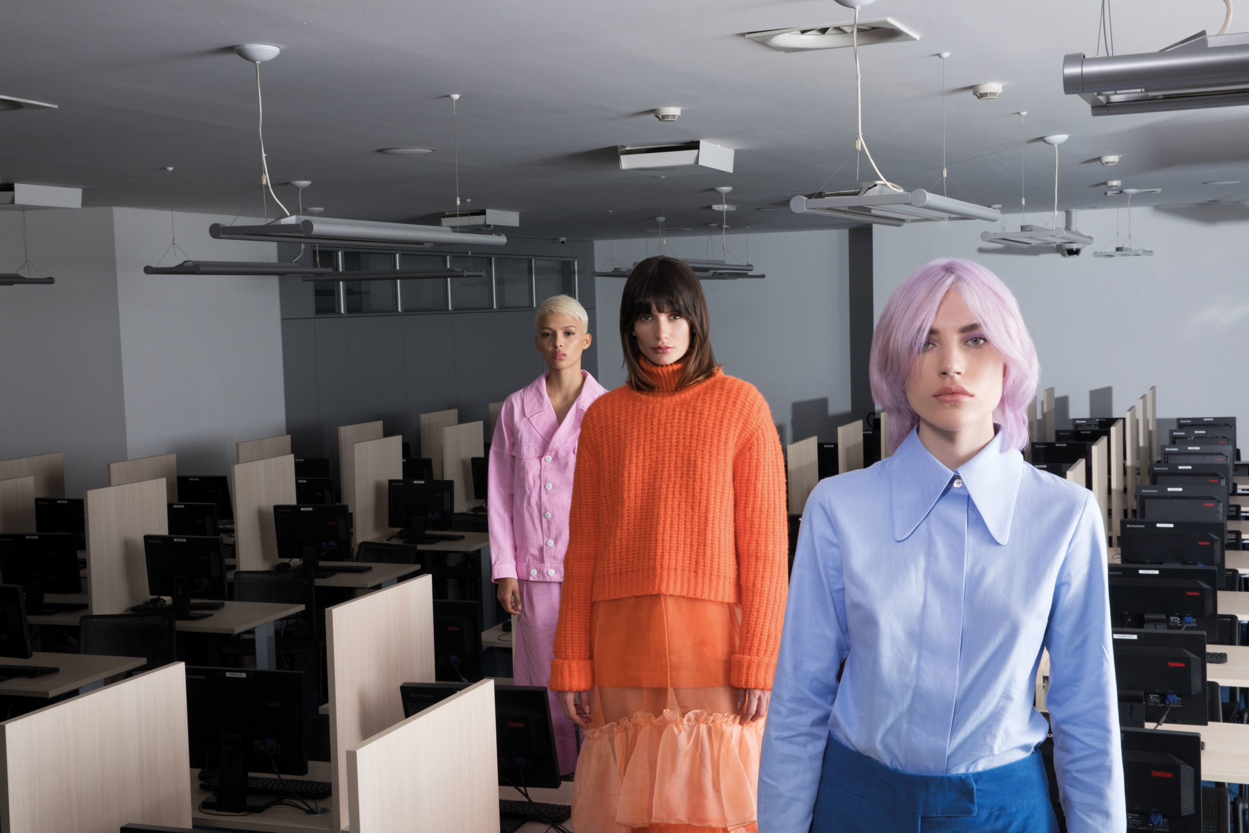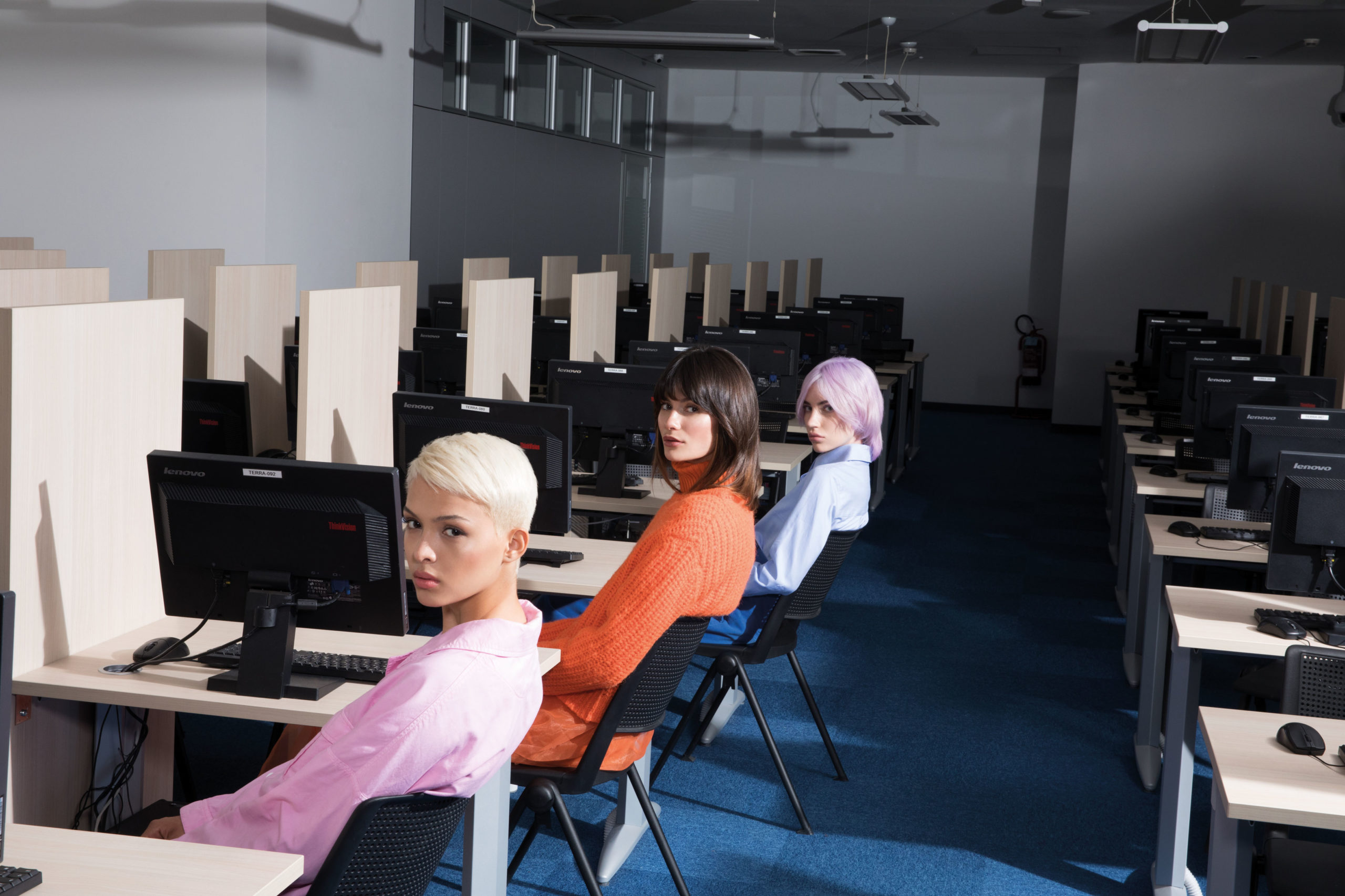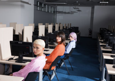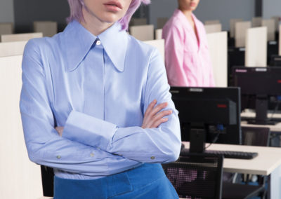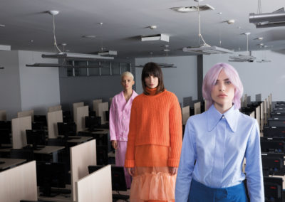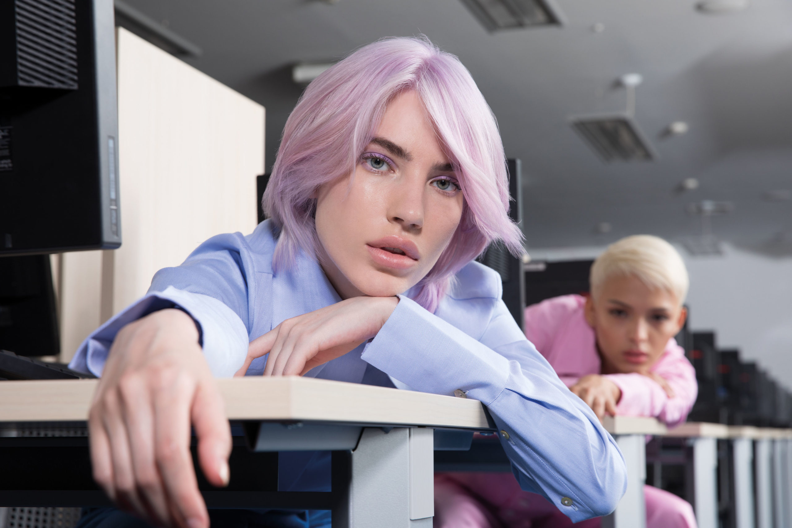 Il secondo mood, Duty , presenta invece una bellezza peculiare, per riflettere sui canoni classici a cui ci siamo ispirati nel tempo, ridefinendoli attraverso un approccio più fluido, inclusivo. Il luogo di lavoro è una passerella dove valorizzare il proprio look senza dimenticare lo spirito di aggregazione, non per essere al di fuori del gruppo, ma per renderlo più forte. Sugli abiti, i colori sono accesi: il rosa, l’azzurro e l’ocra si intensificano virando sul rosso, il blu e l’arancio. Le forme invece sono morbide, evocando il comfort più totale, ma allo stesso tempo esaltano la femminilità 2.0, senza bisogno di esporre, ma valorizzando elegantemente l’essere. I capelli sono attori primari all’interno di questo stile, senza bisogno di imporsi, ma sottolineando una voglia di sperimentazione più o meno ardita. I fondi biondo ghiaccio offrono la possibilità di osare con i pastelli: delicati baby lavanda e rosa pesca; i marroni più intensi di inserire punti luce che armonizzino i lineamenti, rendendo l’autunno/inverno più Tropics, come uno dei look della collezione. Gli styling sono soavi, a esaltare la salute dei capelli. Di contro, il wet look è alternativa di rottura per un mood che non conosce timidezza.