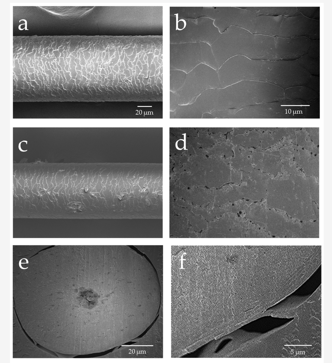 La cuticola è stata osservata sotto forma di scaglie sovrapposte l’una sull’altra. D’altra parte, nelle immagini della superficie dei capelli esposta alla radiazione UV osservata a ×500 (c) e ×2000 (d),